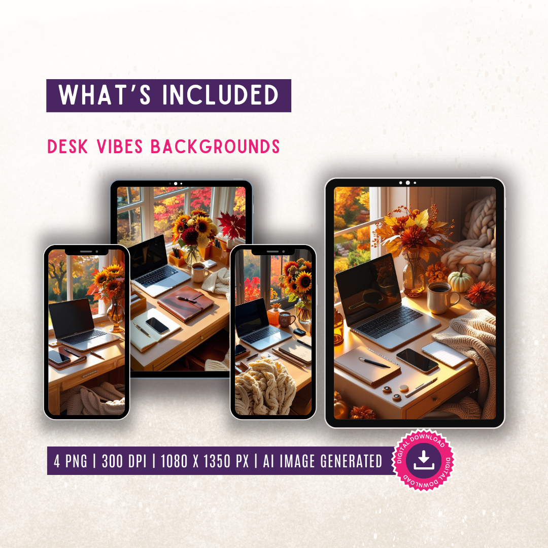 - 4 desk background images (PNG format, 1080 x 1350px, 300 dpi)