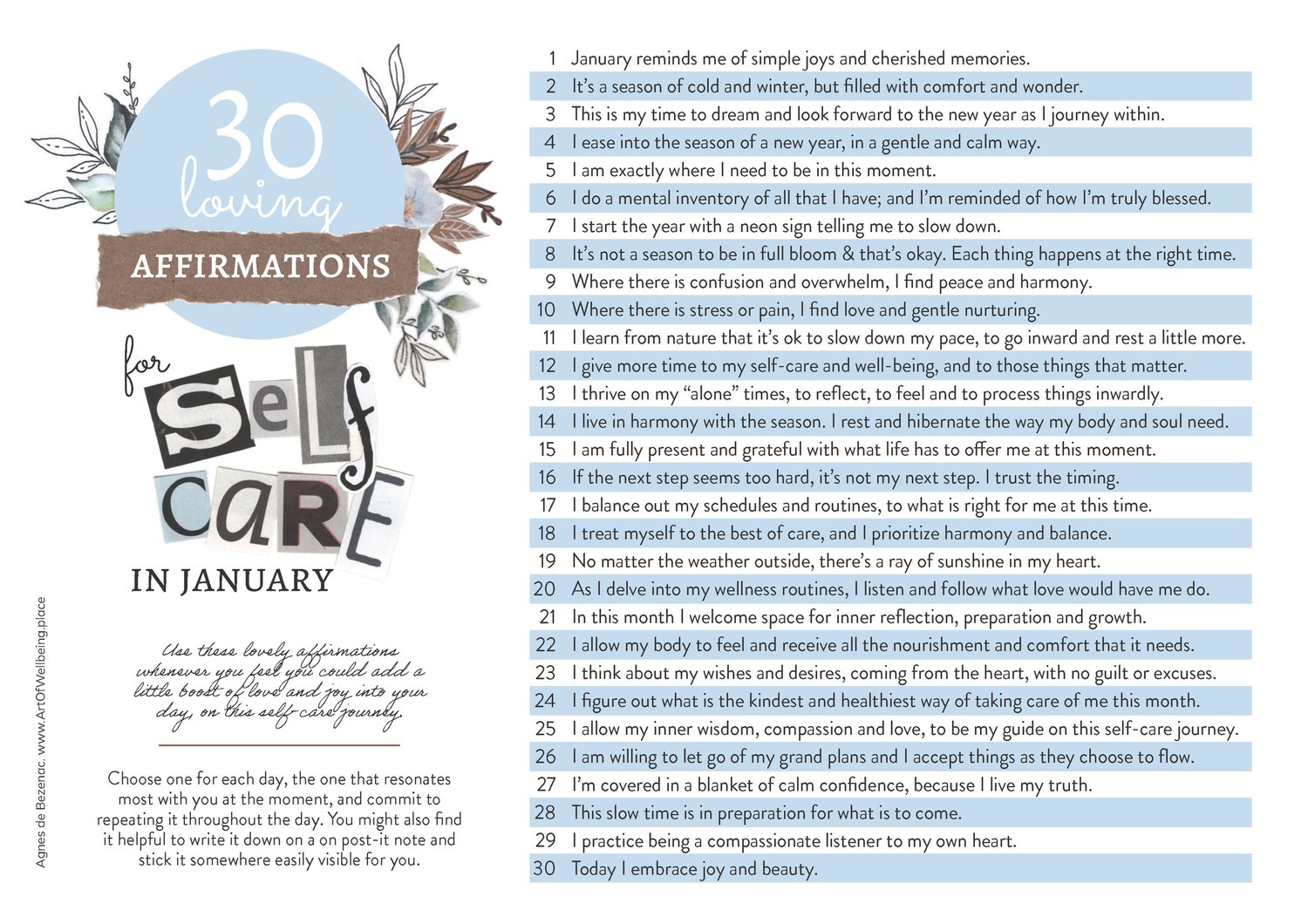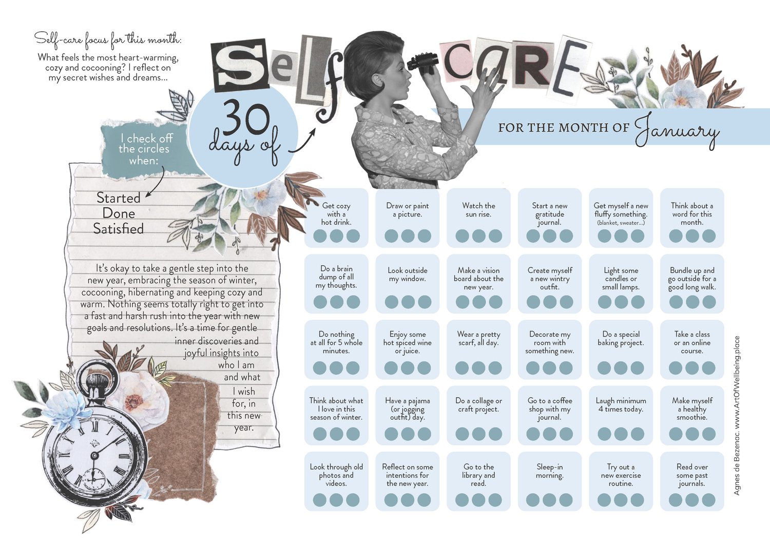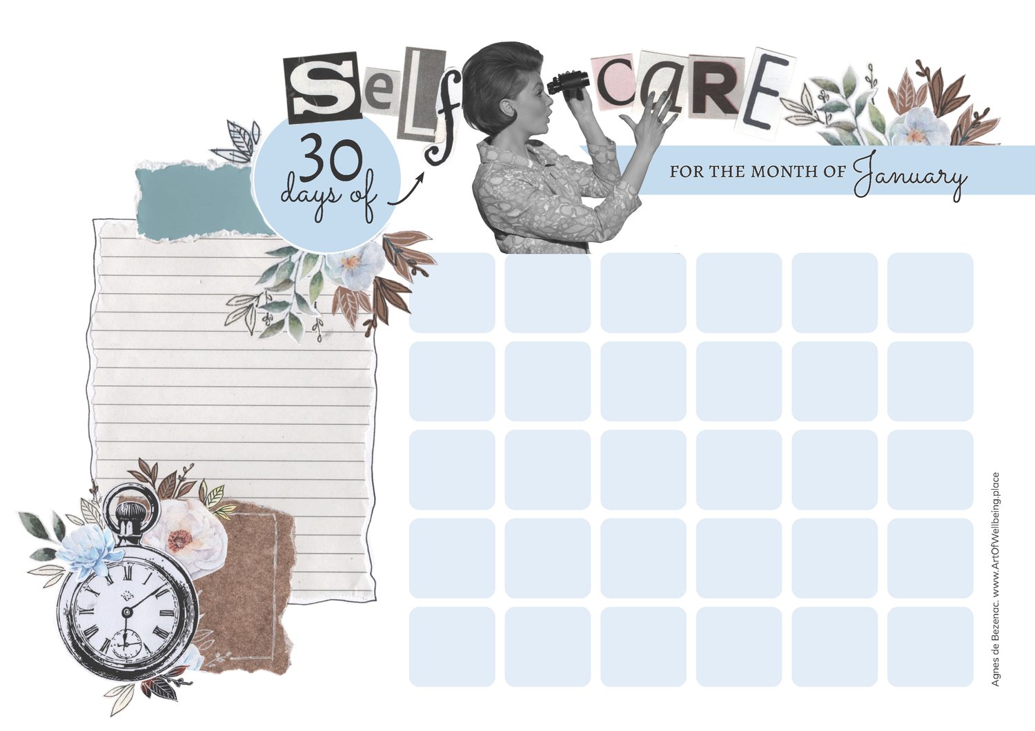 A beautifully designed calendar gift for your self-care, for the month of January. 1 idea and 1 postive affirmation for each day, as well as empty calendar sheets for you to personalize yourself. Hope you enjoy.
