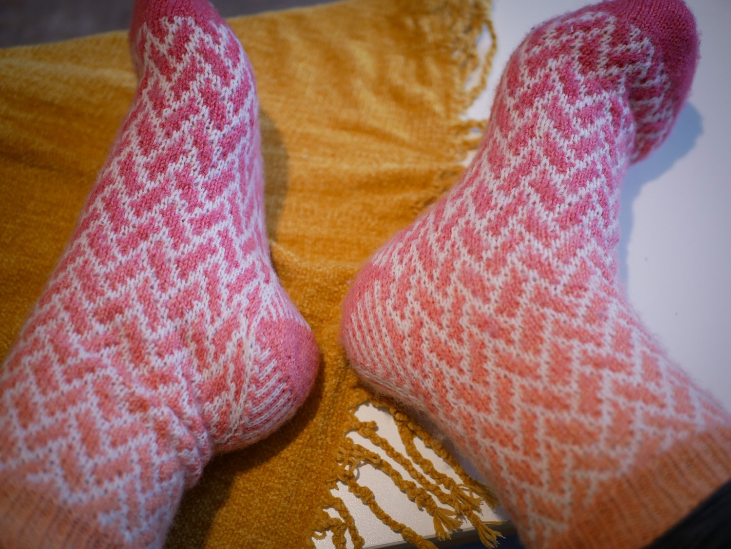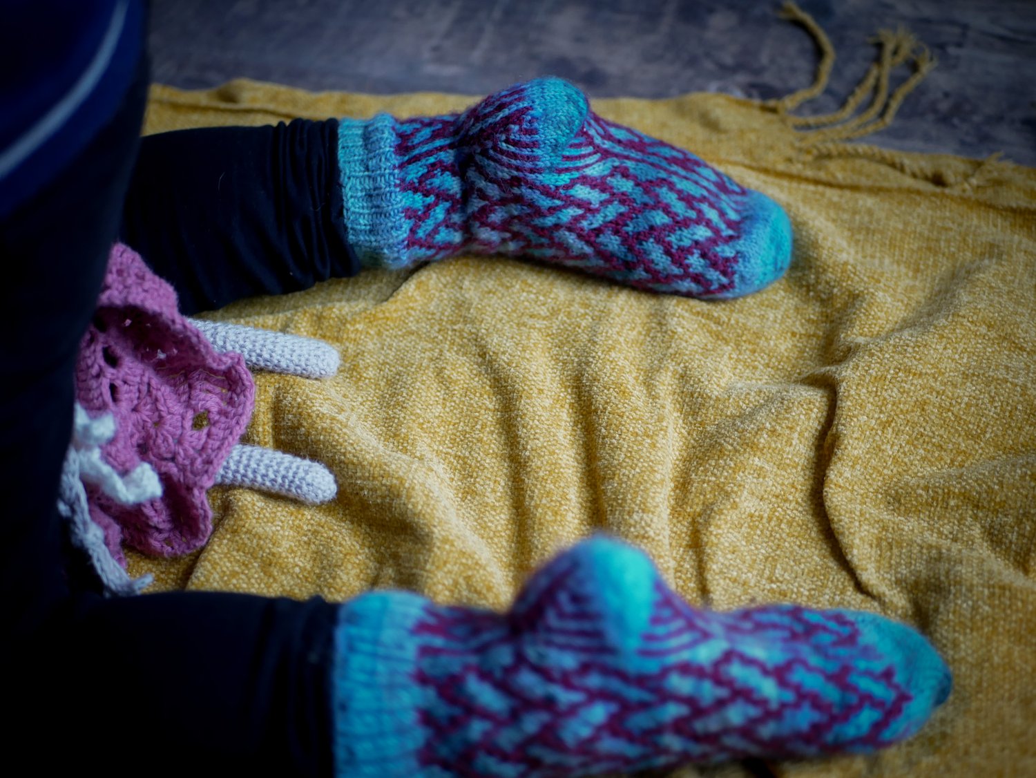 Les chaussettes Farfelues sont, comme leur nom l’indique, farfelues dans leur construction. C’est un modèle toe-up mais qui commence par un montage provisoire afin que le rang commence au milieu du pied dessous. C’est un modèle qui met en avant un point mosaïque que l’on retrouve tant sur le corps de la chaussette que sur le talon. Ce dernier est tricoté à base d’augmentations, de diminutions et d’une section en rangs raccourcis. Il donne une drôle de tête à la chaussette à plat mais il épouse très bien le pied et a l’avantage d’avoir un gousset adaptable au cou-de-pied.