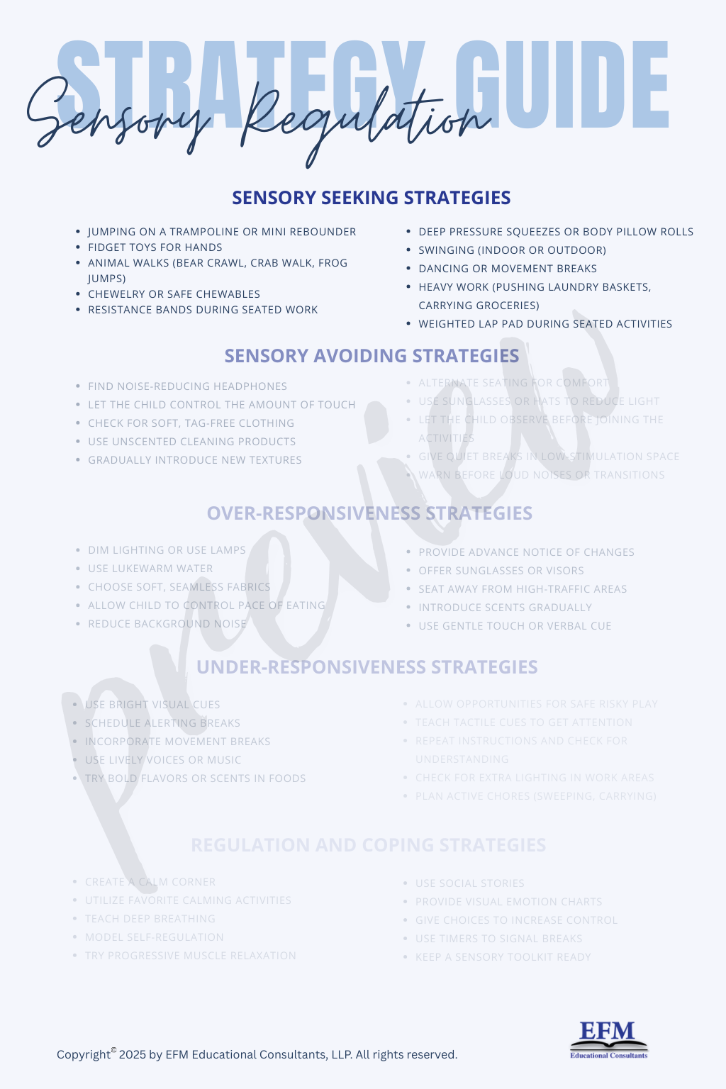This free guide is created for parents, caregivers, therapists, and anyone supporting an individual with sensory sensitivities. Inside, you’ll find practical, easy-to-use strategies for sensory seekers and sensory avoiders, along with tips for those who are either overresponsive or underresponsive to their environment. It also includes regulation and coping strategies designed to help individuals regain balance and feel in control.