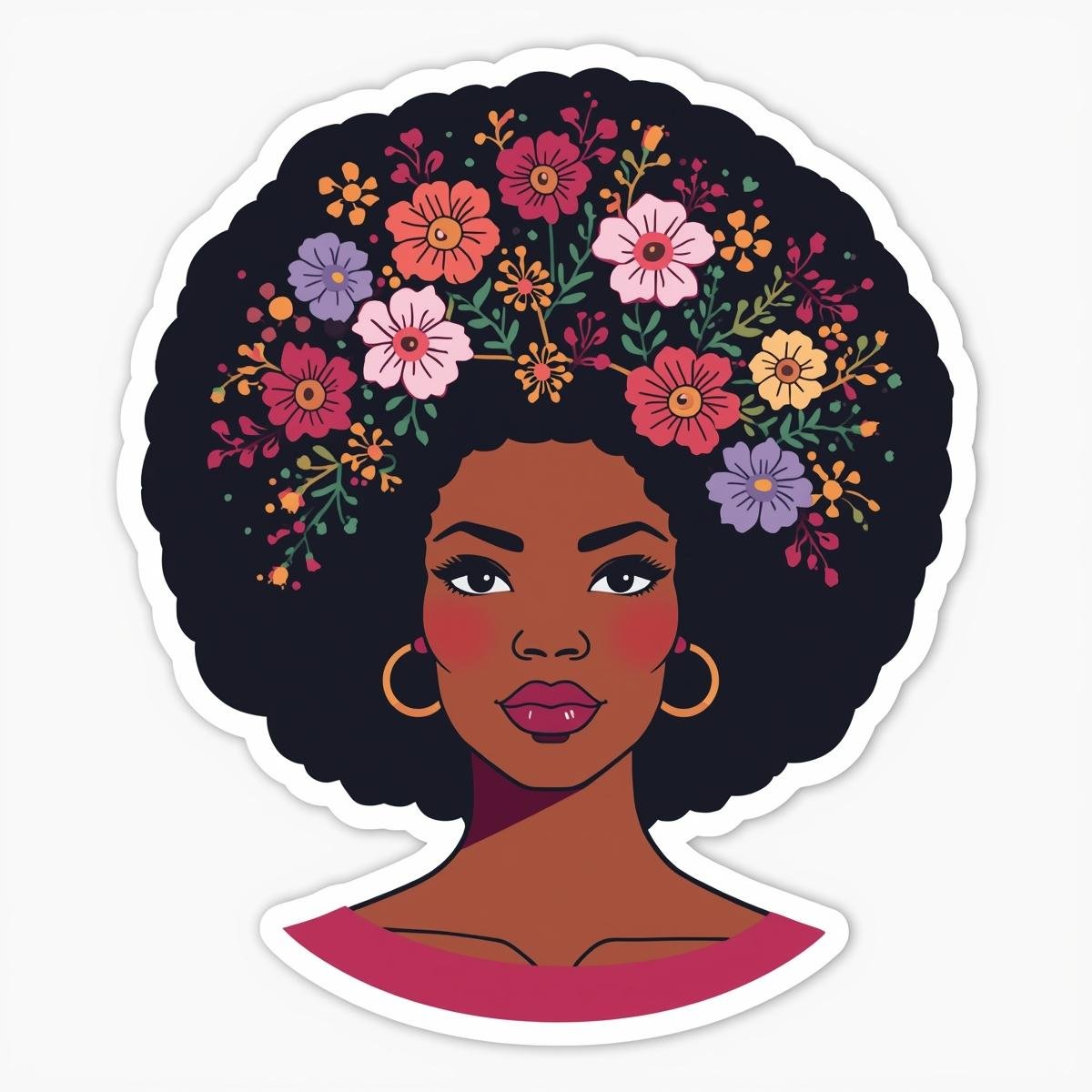 Find a sticker of a lady rocking her Afro hair with floral accessories. Purchase, download and lastly, print out the sticker.