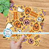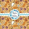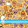 Sassy Halloween witch theme with hats, poison apples, otions, pumpkins, ghosts and skulls on yellow gold.