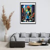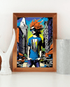 *Colorful graphic print depicting a young man trendily dressed and posing as in a high-fashion photo shoot before a New York City skyline background*