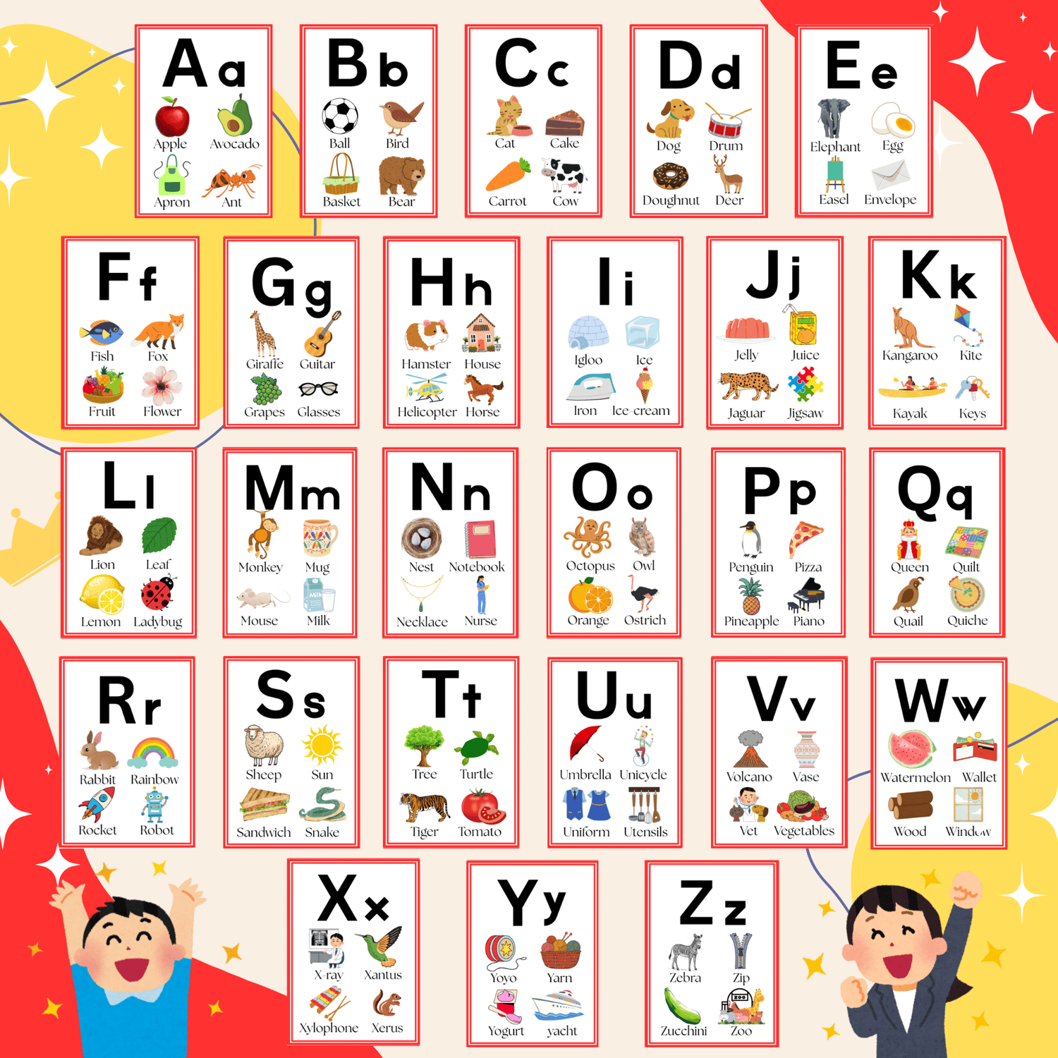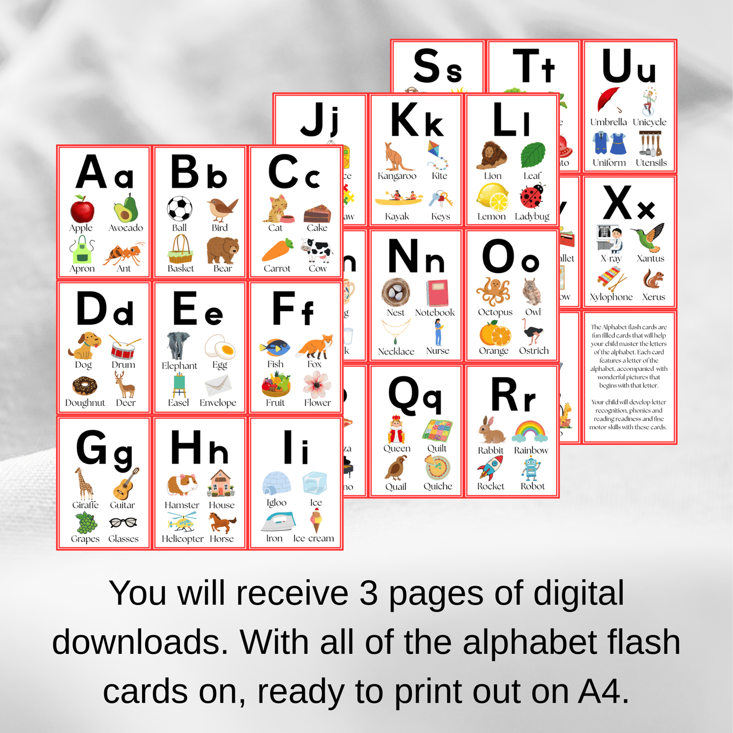 Learn your alphabet with these colourful, enjoyable flash cards. Designed to make learning easy. With simple uppercase and lowercase letters, allowing children to learn letter recognition and associations with the pictures provided.
