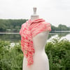 The Raindrops on Roses Shawl is a crescent shaped shawl. The body features a simple, mildly textured stitch that repeats throughout. The edging is open and lacy, and the very last row has minimal beading.