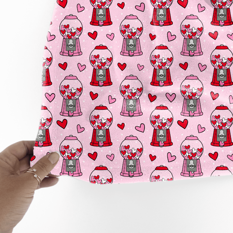 Bubblegum in red and pink heart shapes with retro bubblegum dispensers.