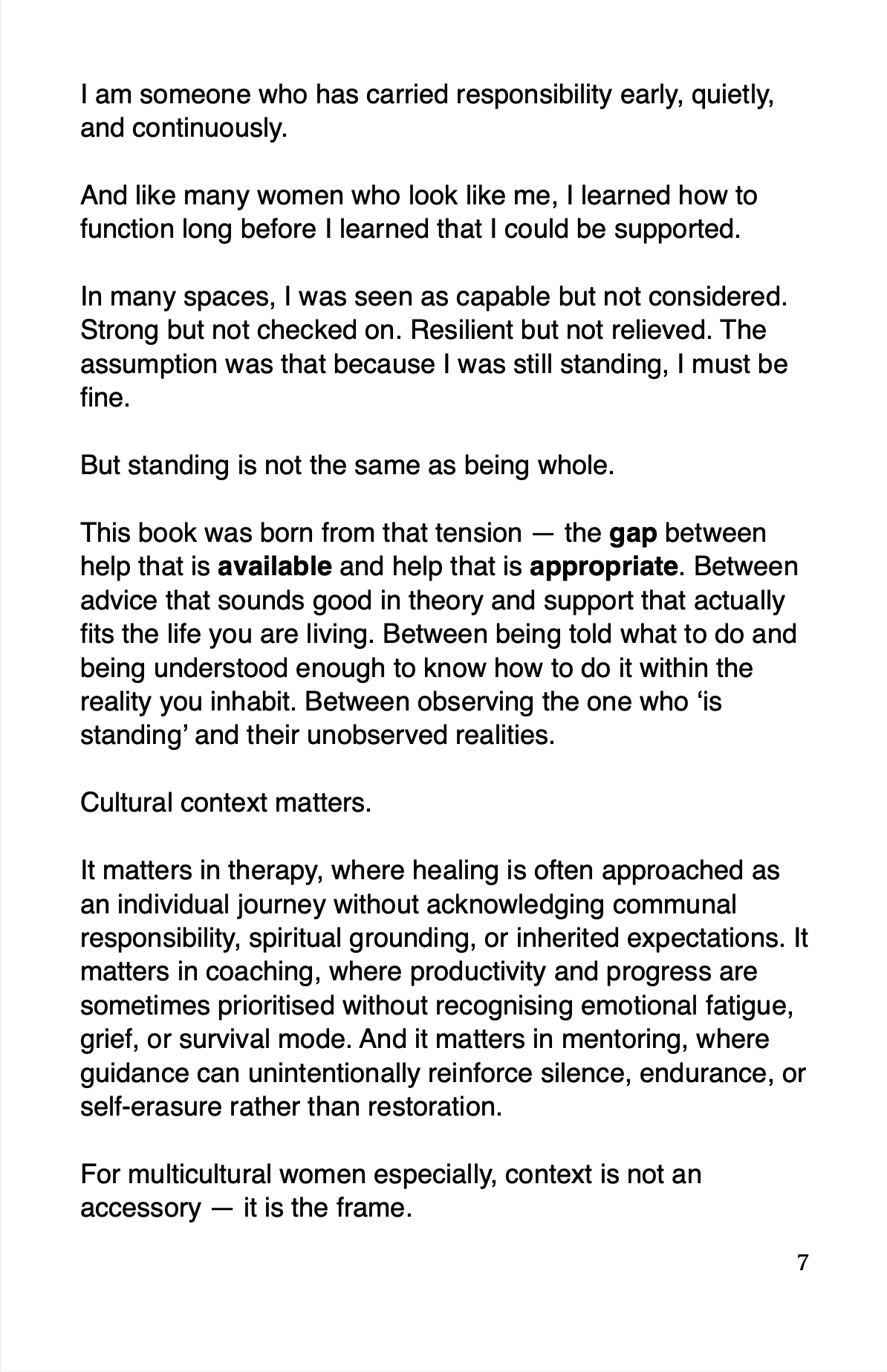 The book unfolds in three parts. The first names the harm that occurs when care is offered without cultural awareness. The second explores the invisible weight many people carry as a result. The third turns toward what healing can look like when understanding, humility, and context are honoured—not as an add-on, but as foundational.