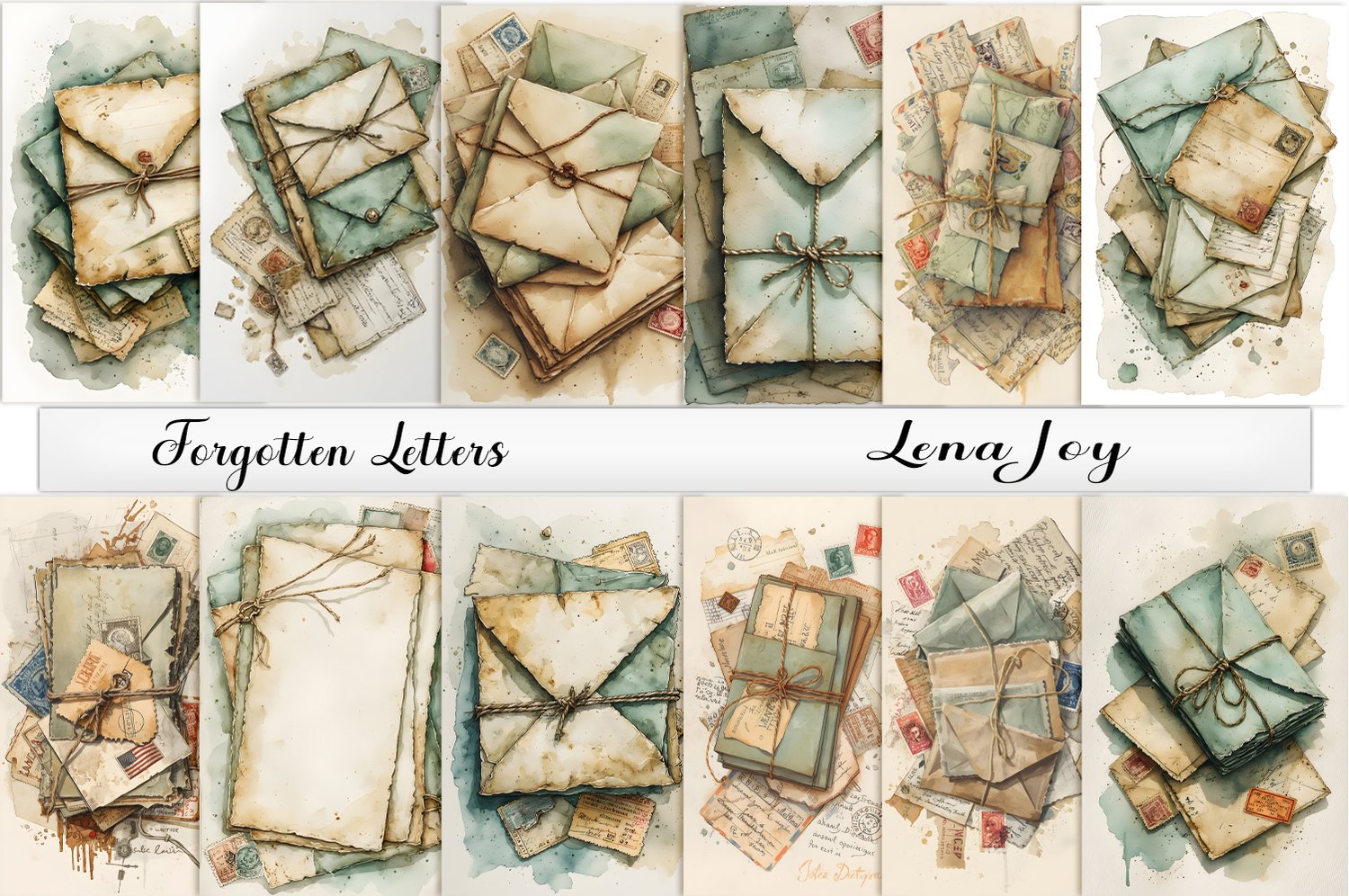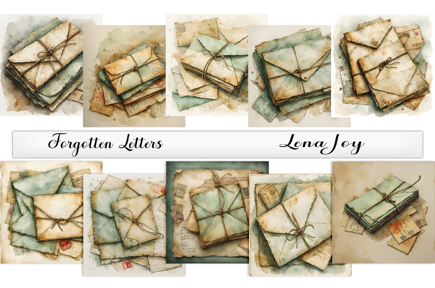Keywords—shades of green, shades of tan, nostalgic, vintage, forgotten letters, letters, notecards, envelopes, junk journal, backgrounds, papers, pages, antique, old, stamps, handwriting, twine, bundled mail, mail