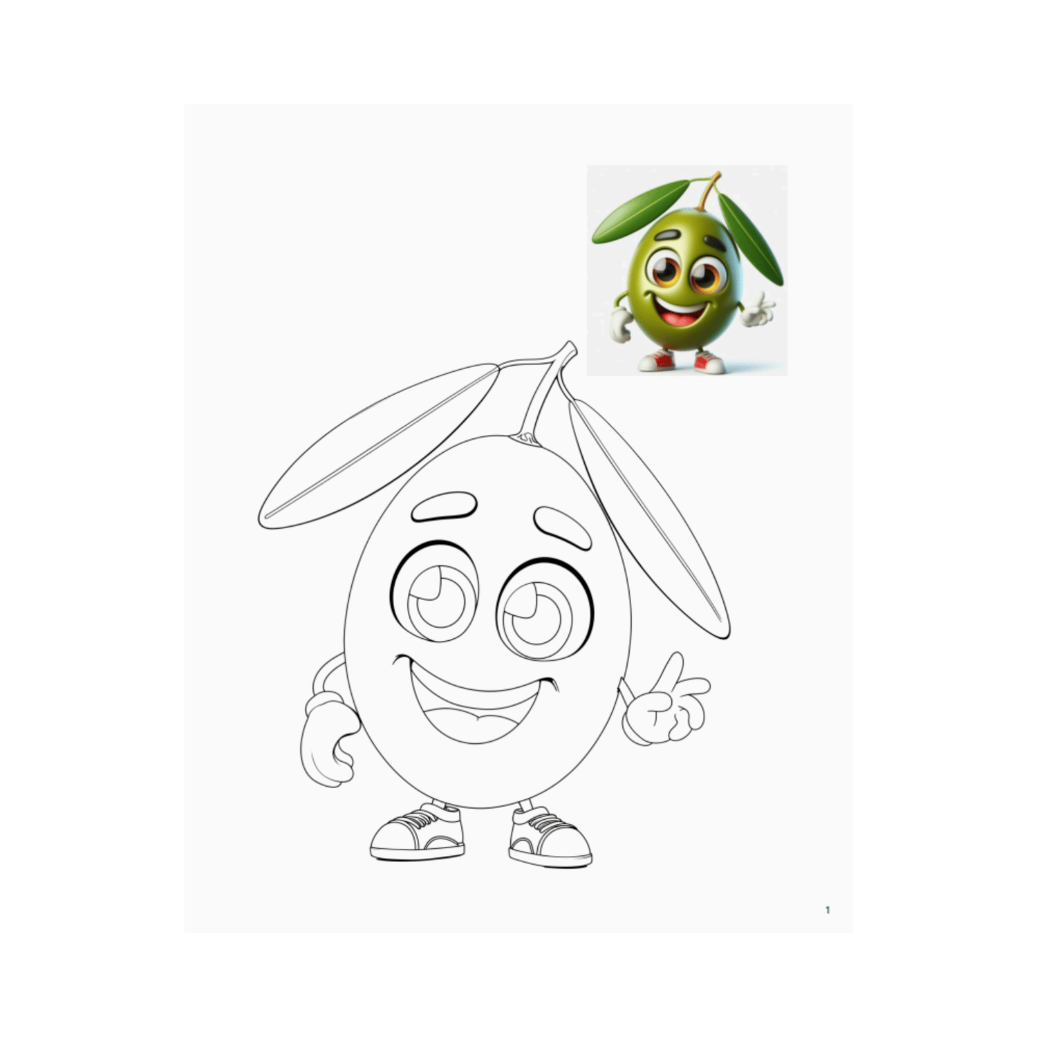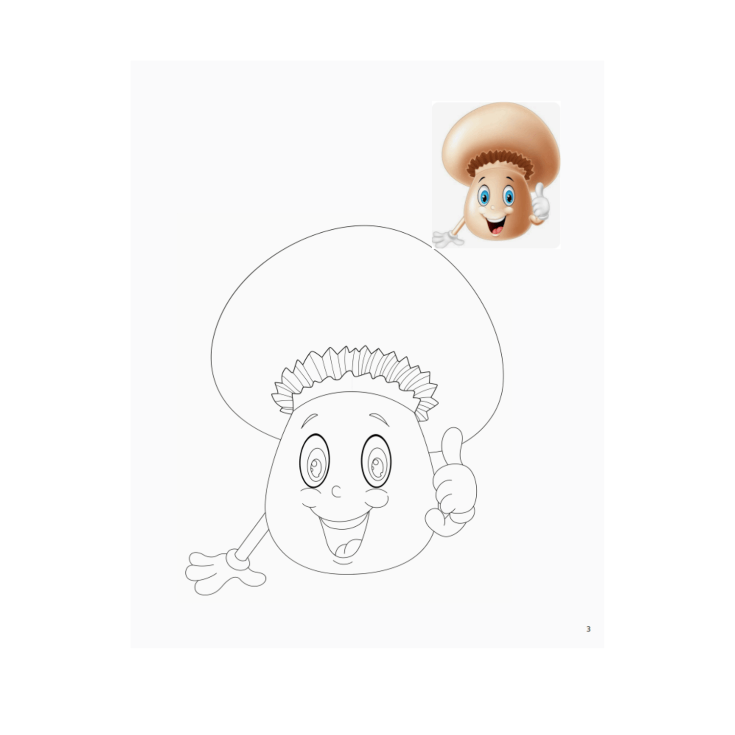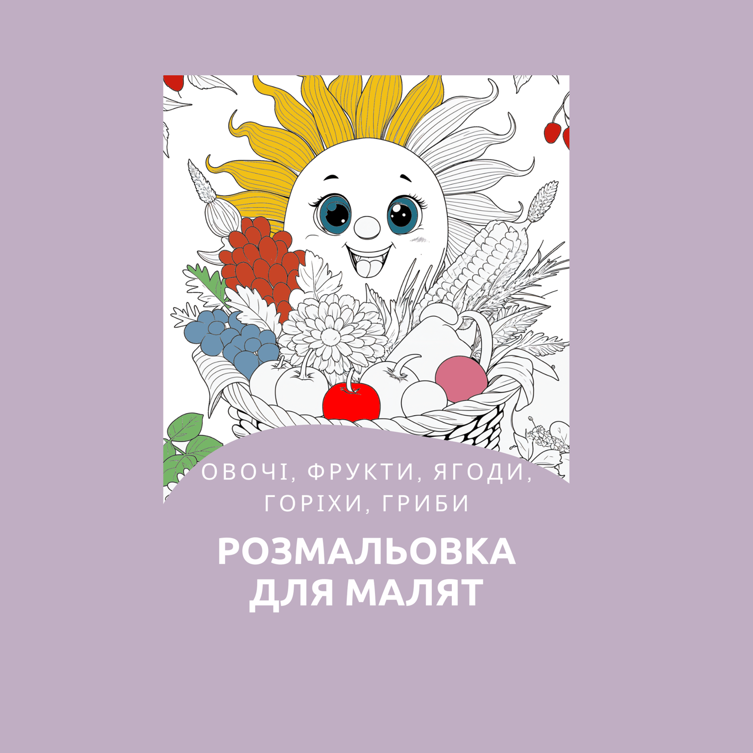 Усередині 60 сторінок із простими чорно-білими картинками овочів, фруктів, ягід, грибів та горіхів.