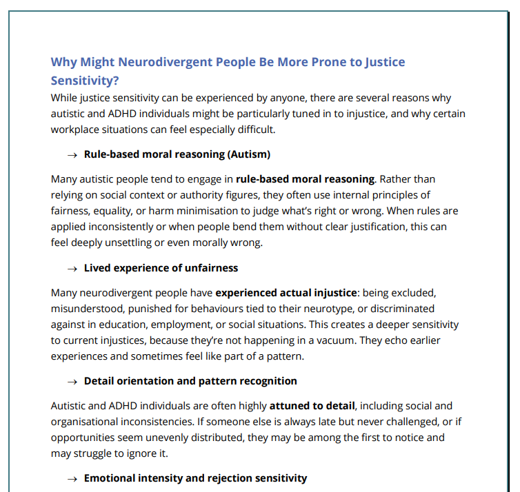 This guide is designed to support neurodivergent individuals, including autistic and ADHD employees, in understanding and managing justice sensitivity at work. Justice sensitivity refers to how strongly we feel about fairness, and it can deeply impact your emotional well-being, job satisfaction, and performance in the workplace.