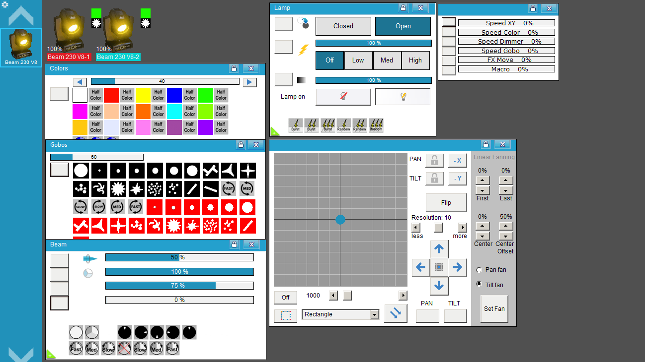 • Velocidad de Pan y Tilt, de Colores, de Dimmer, de Gobos.