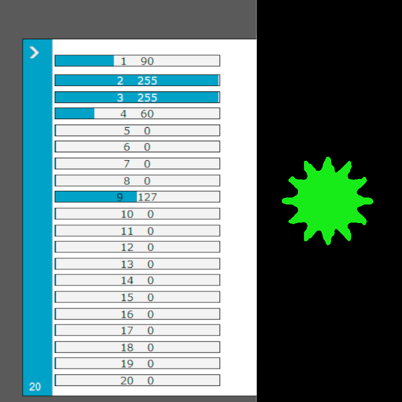 * Verifique, con un Fixture de pruebas (click), que coincidan estos canales: 3 Dimmer, 2 Strobo / Shutter, 1 en el valor 90 = Color Verde, 4 en el valor 60 = Gobo de Sol, 9 foco (tercer foto).
