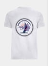 These product is a white cotton tee has a small print on the front left and a large print on the back.