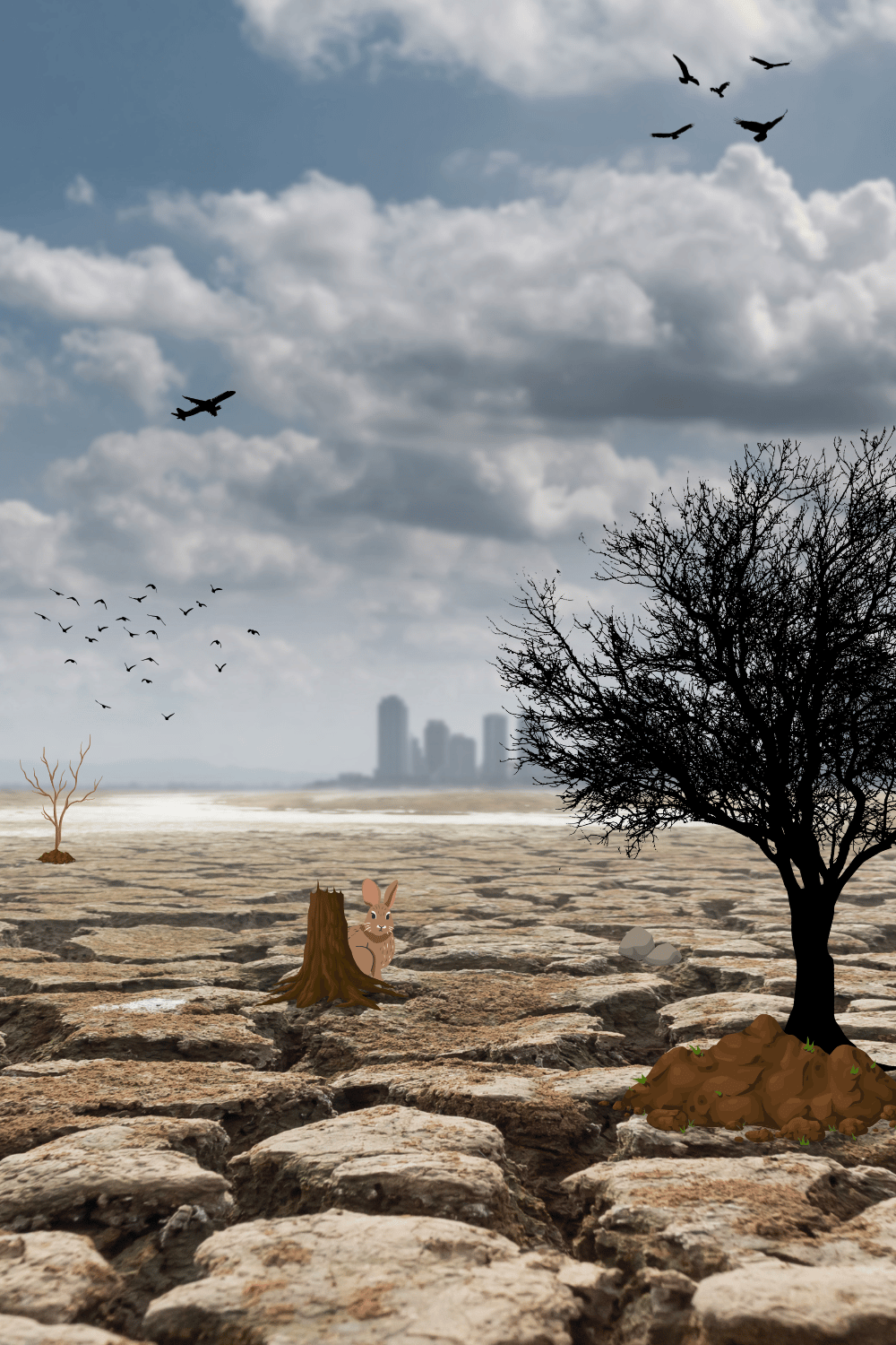 Immerse yourself in this evocative portrait, capturing the stark beauty of a dry landscape. With parched earth and barren trees, the scene is complemented by birds soaring above, symbolizing freedom amidst adversity. A lone figure’s hair peeks from behind a weathered tree stump, adding a mysterious, human element to the solitude. In the distance, a city stands on the horizon, representing a world far removed from the arid stillness of the present.