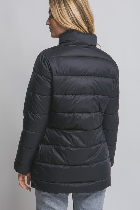 Stay warm while serving looks with The Skyline Quilted Puffer. Designed with a sleek quilted finish, side zipper pockets, and a full zip closure, this longline puffer combines function with fashion. Filled with lightweight synthetic down and crafted from durable 100% nylon, it’s wind-resistant and built for cold-weather days without sacrificing style.
