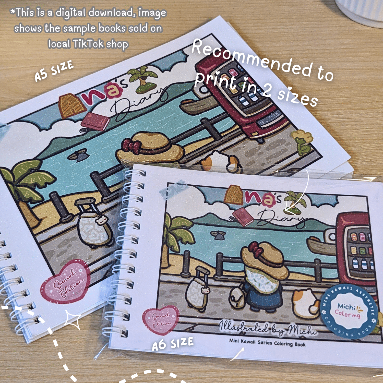 - standard A4 size (297mm x 210mm) in landscape mode. However, best to be printed in A5 size or half US letter size as this is mini kawaii series coloring book! (you may also print the book in A6 or quarter US letter if you wish, like how we are selling the hardcopy version on our local marketplace, visit us on our TikTok @michi.coloring)