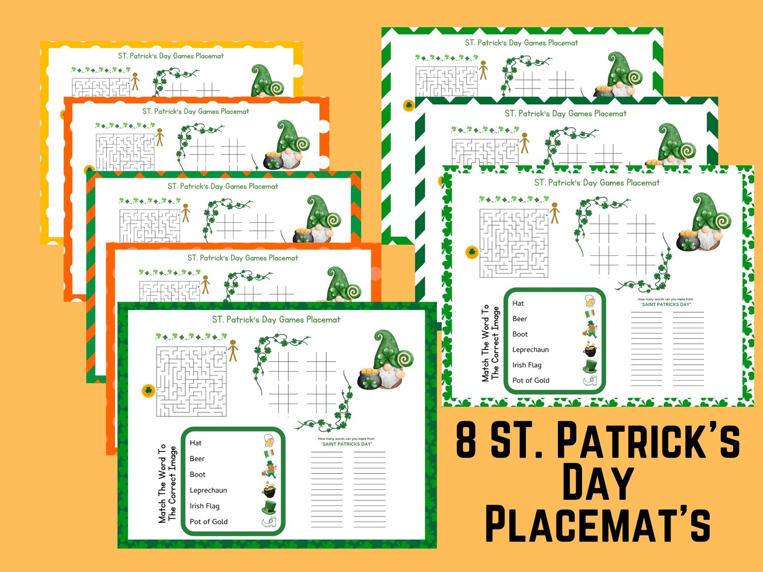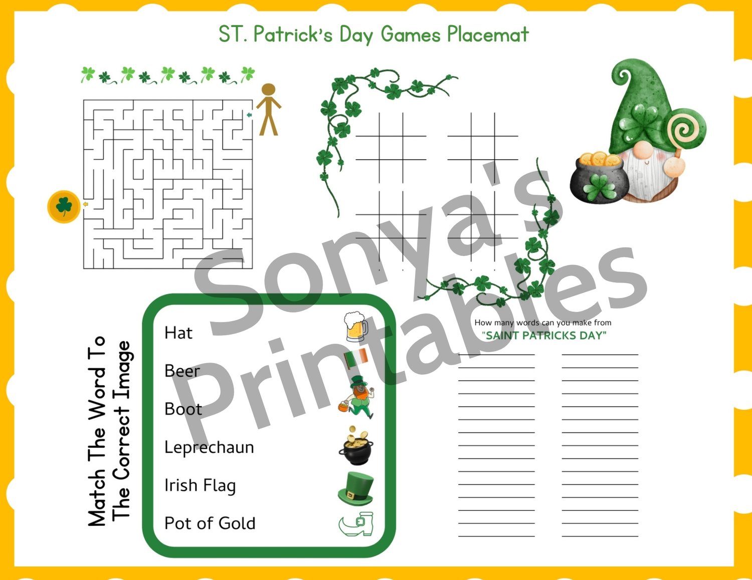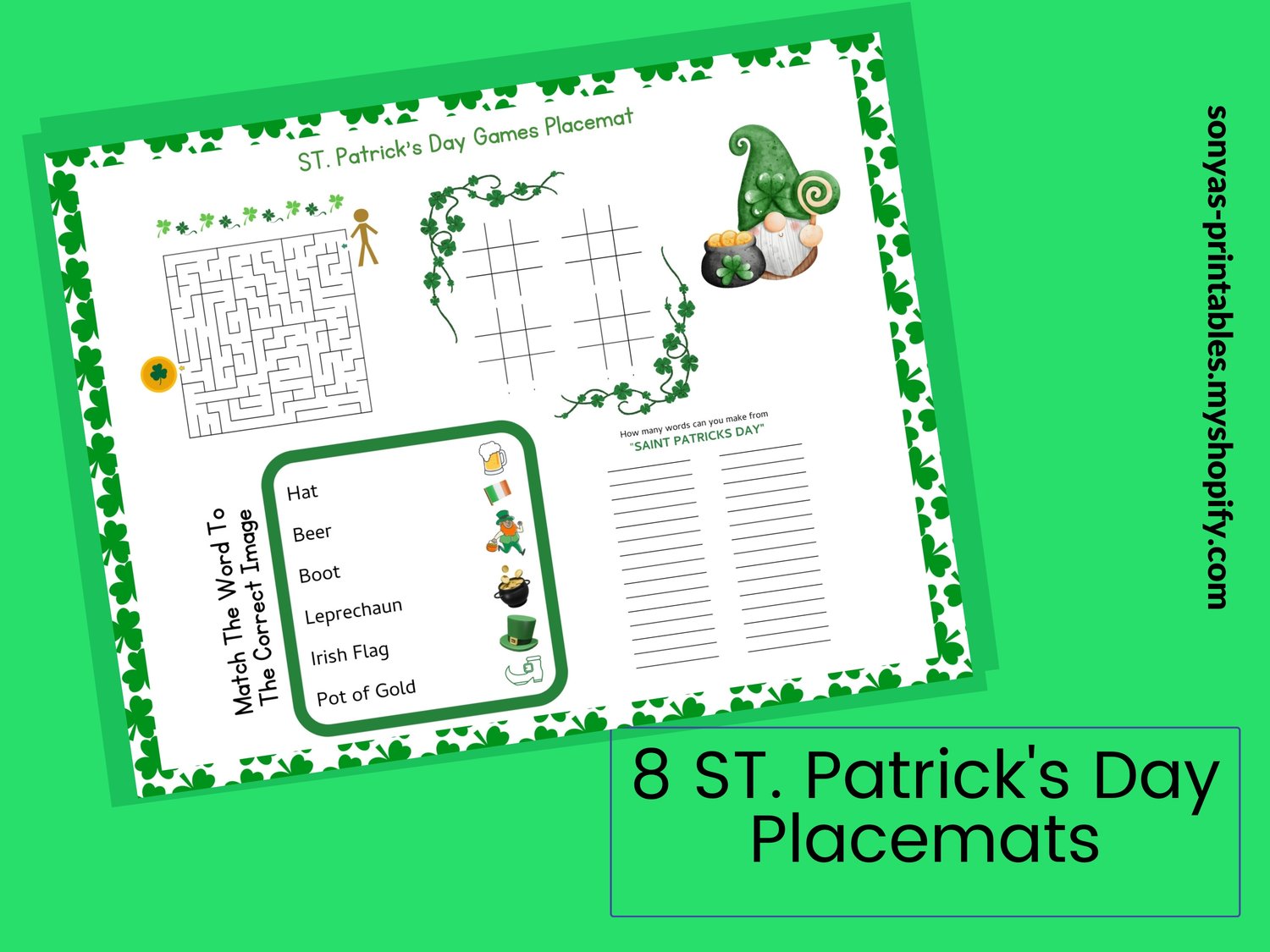 These unique and colorful ST. Patrick's Day Activity Page Placemats will keep your children (or you) busy for a bit! It features a maze, tic tac toe, word match and another word game.