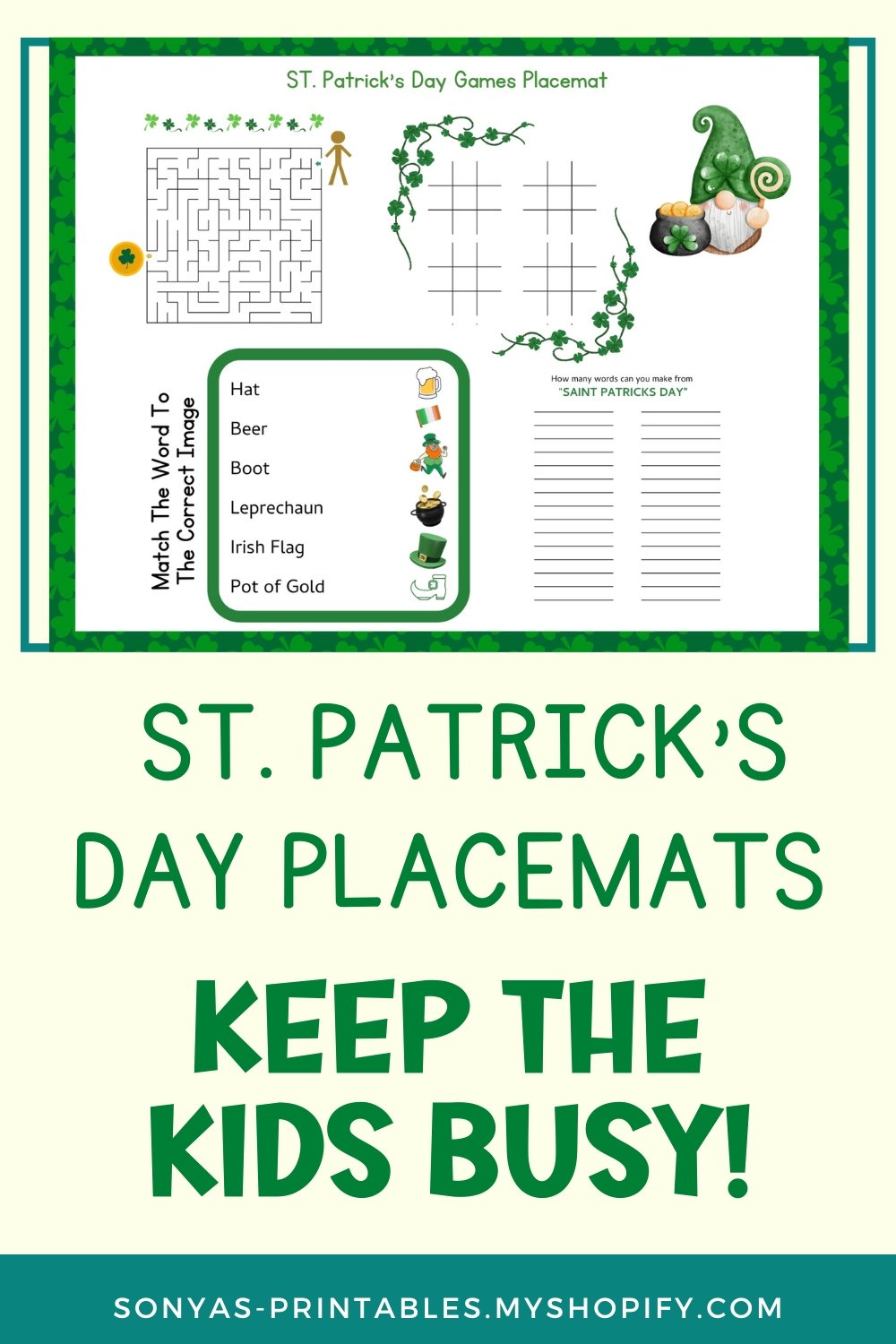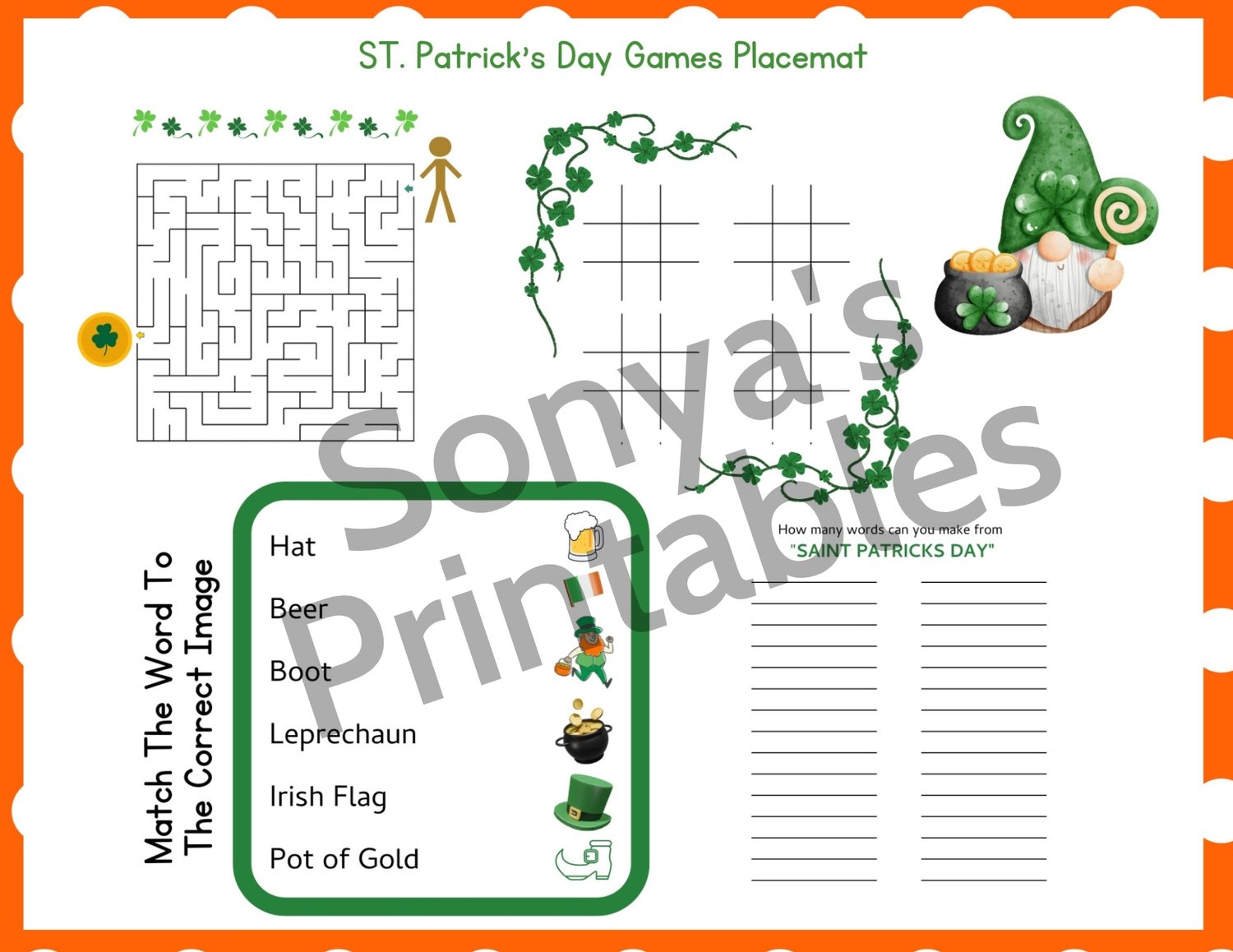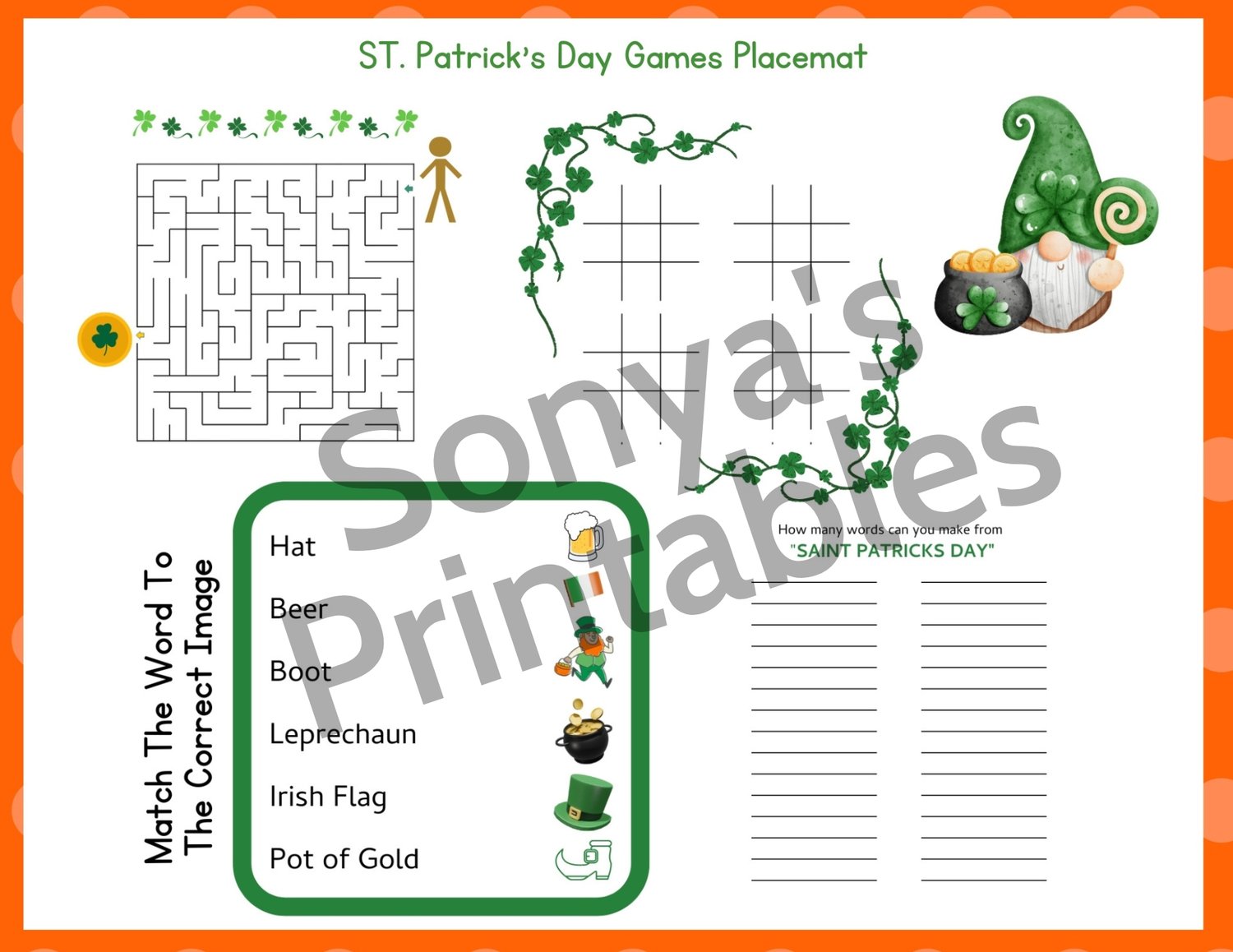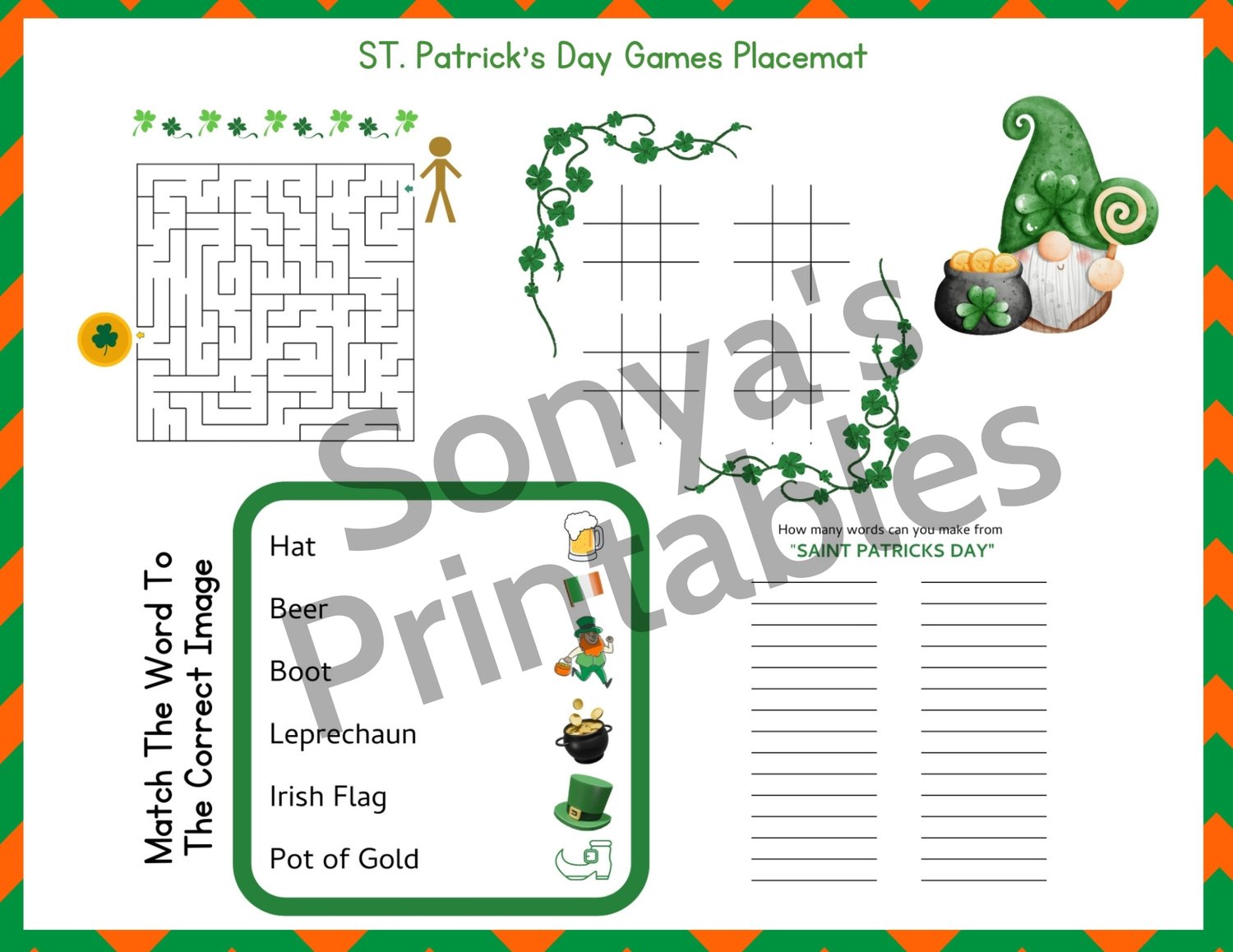 These unique and colorful ST. Patrick's Day Activity Page Placemats will keep your children (or you) busy for a bit! It features a maze, tic tac toe, word match and another word game.