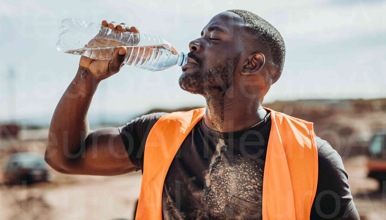 Construction worker drinks water on hot day