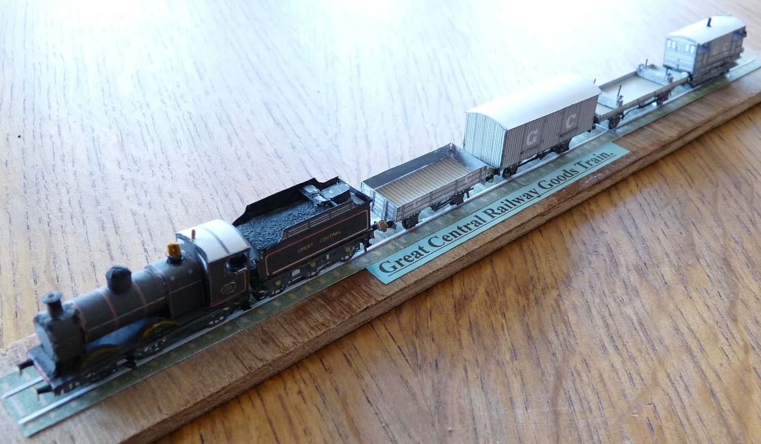 This is a 2015 designed card kit with later updates to cut out and assemble which builds to a complete goods train measuring approximately 11” long with included track base. Comprising 9J class Robinson 0-6-0 locomotive (LNER J11 class), 15 foot wheelbase van, dropside wagon, double bolster wagon, 15 ton 6 wheel brake van and track base. This model represents a short goods train of typical vehicles circa 1905.