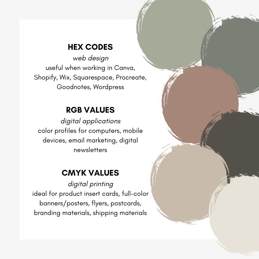 + Detailed Hex Codes, RGB, and CMYK values for each color