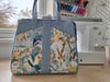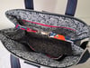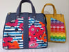 This gorgeous tote with short handles to fit on your arm or for swinging about wherever you go. Show off your bold printed fabrics on the 2 geniously designed outer pockets (if I do say so myself).