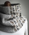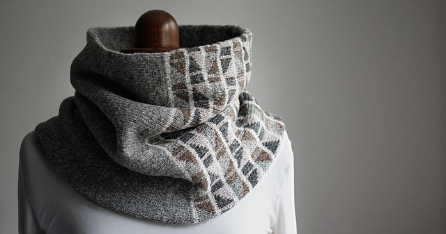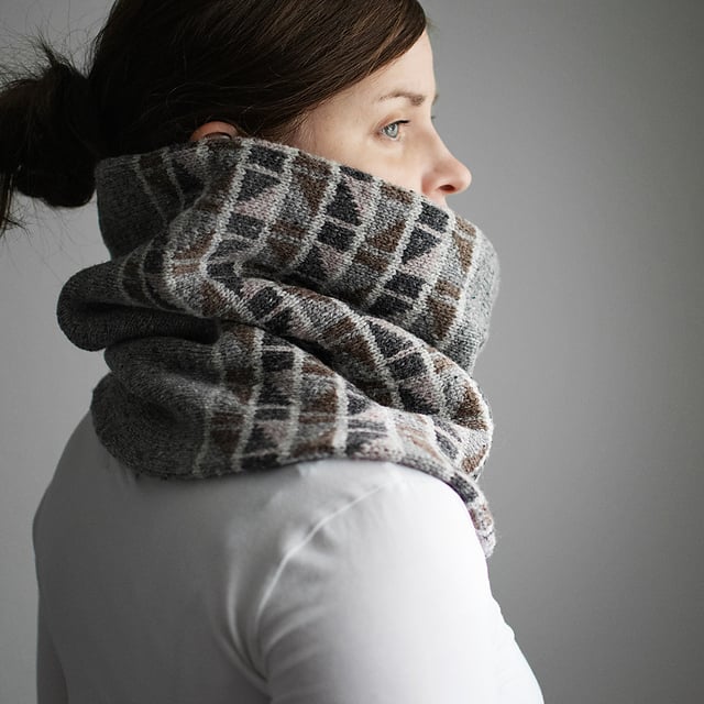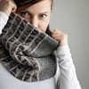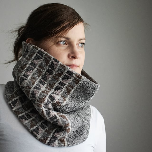 The cowl is worked sideways in the round. Starting with a provisional cast on it is structured into a colorwork element and the body, knit in one color only.