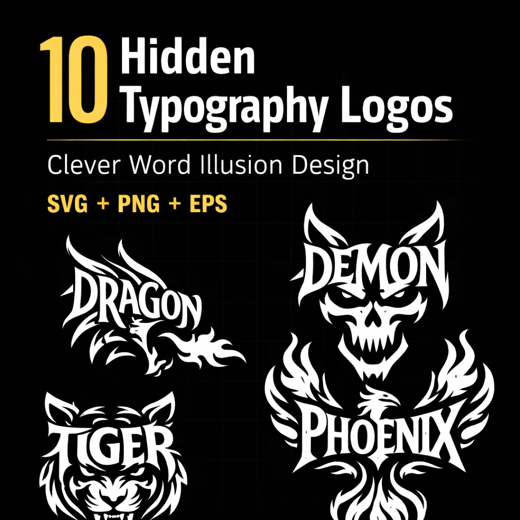 This unique logo bundle features 10 hidden typography designs where the lettering forms animals and mythical creatures. Each logo is carefully crafted to combine typography and illustration into a clever visual illusion.