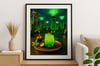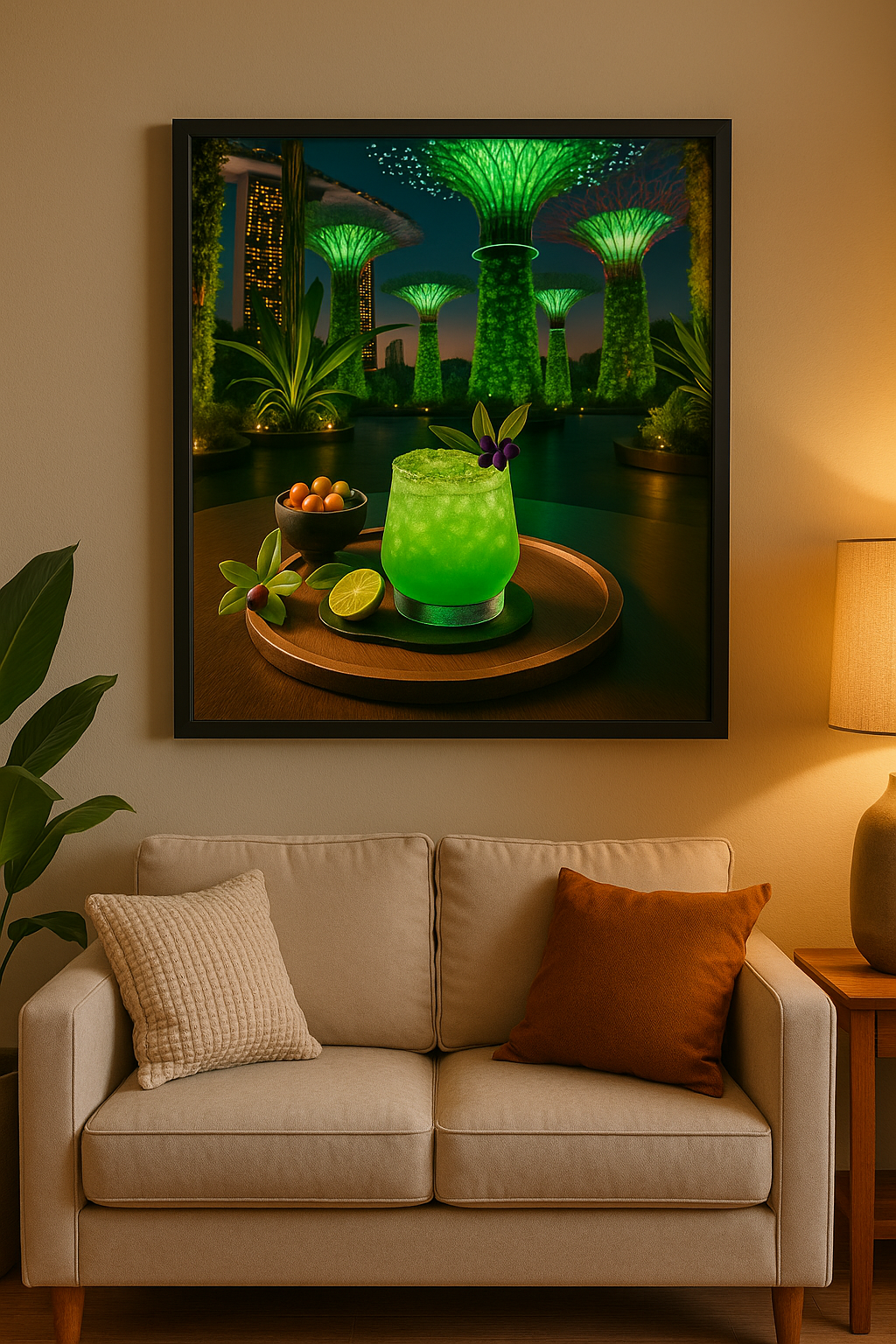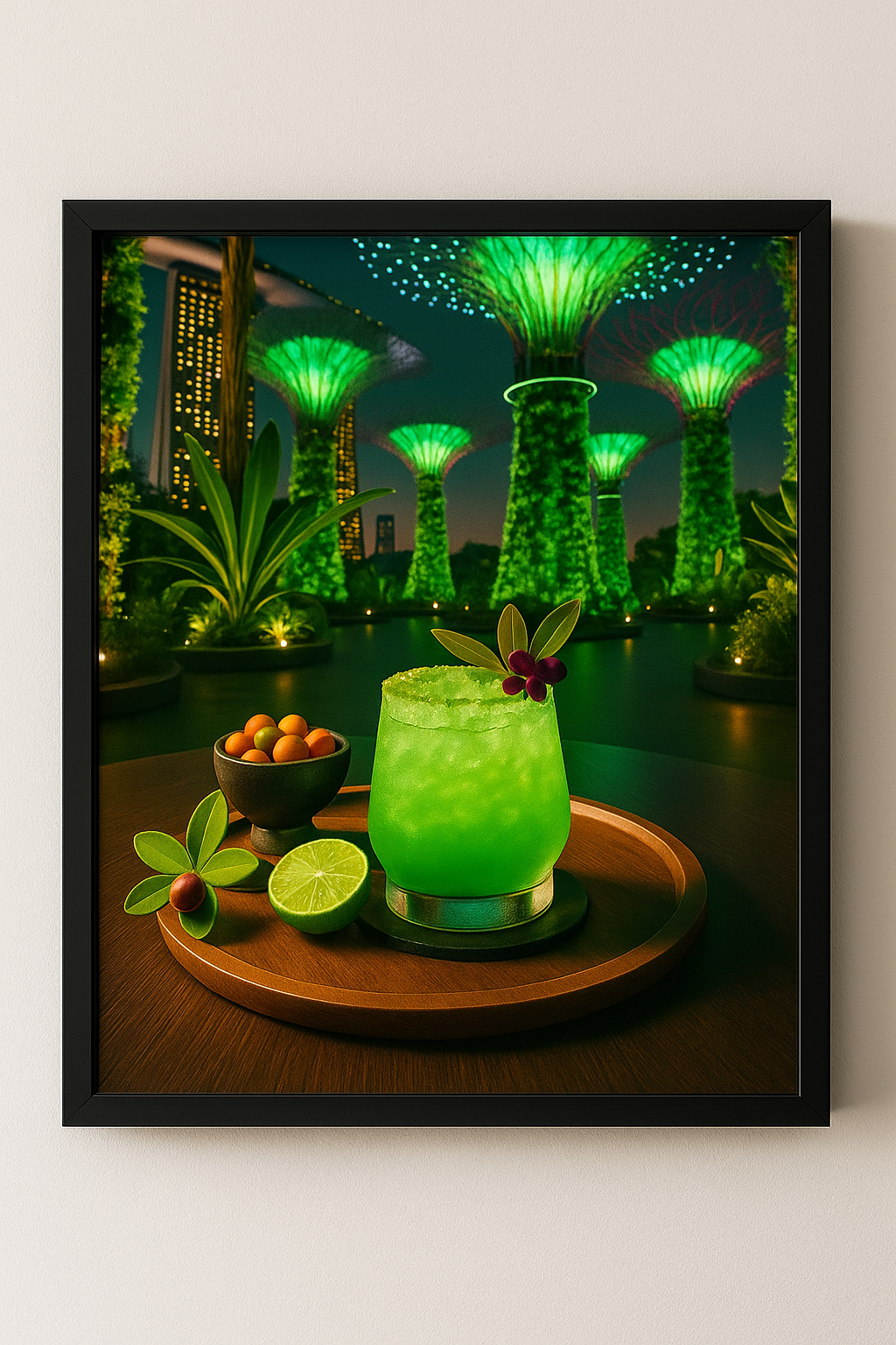 A glowing twilight artwork of Singapore’s iconic Supertrees at Gardens by the Bay, paired with a vibrant lime cocktail. The rich greens and soft twilight skyline bring a refreshing, tropical mood — perfect for wall art, gifts, or anyone longing for the Lion City.