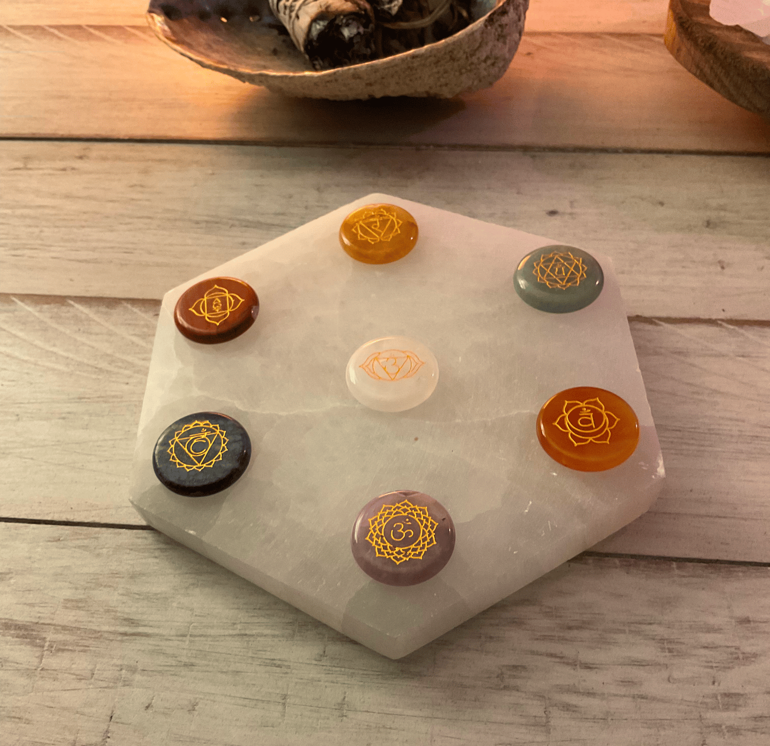 Align your energy and invite balance with this set of seven engraved chakra stones, each measuring 1 inch. Each stone is thoughtfully etched with its corresponding chakra symbol, representing the root, sacral, solar plexus, heart, throat, third eye, and crown centers.