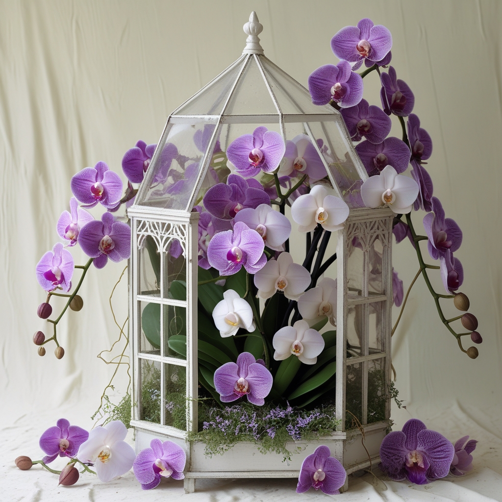 A delicate, Victorian-style miniature greenhouse with intricate wooden latticework and a delicate metal roof, set against a soft, creamy white background, is overflowing with an exquisite arrangement of velvety violet and pure white orchids, their petals delicately ruffled and curved, with subtle gradations of purple and white hues, the plants varying in size and shape, some with delicate aerial roots, others with robust stems, all densely packed within the tiny glass enclosure, with a few stray blooms spilling over the edges, creating a sense of lushness and serenity.