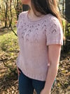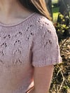This tee—with both written and charted directions—has some easy lace in the yoke and a relaxing stockinette body and sleeves that are mostly knit as you work the yoke. Worked seamlessly from the top down, it is perfect for trying on as you go.