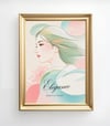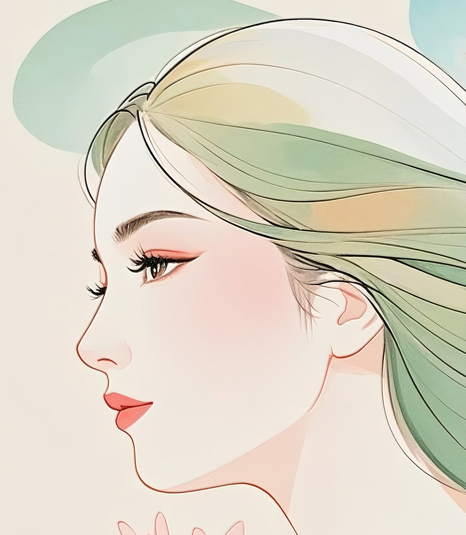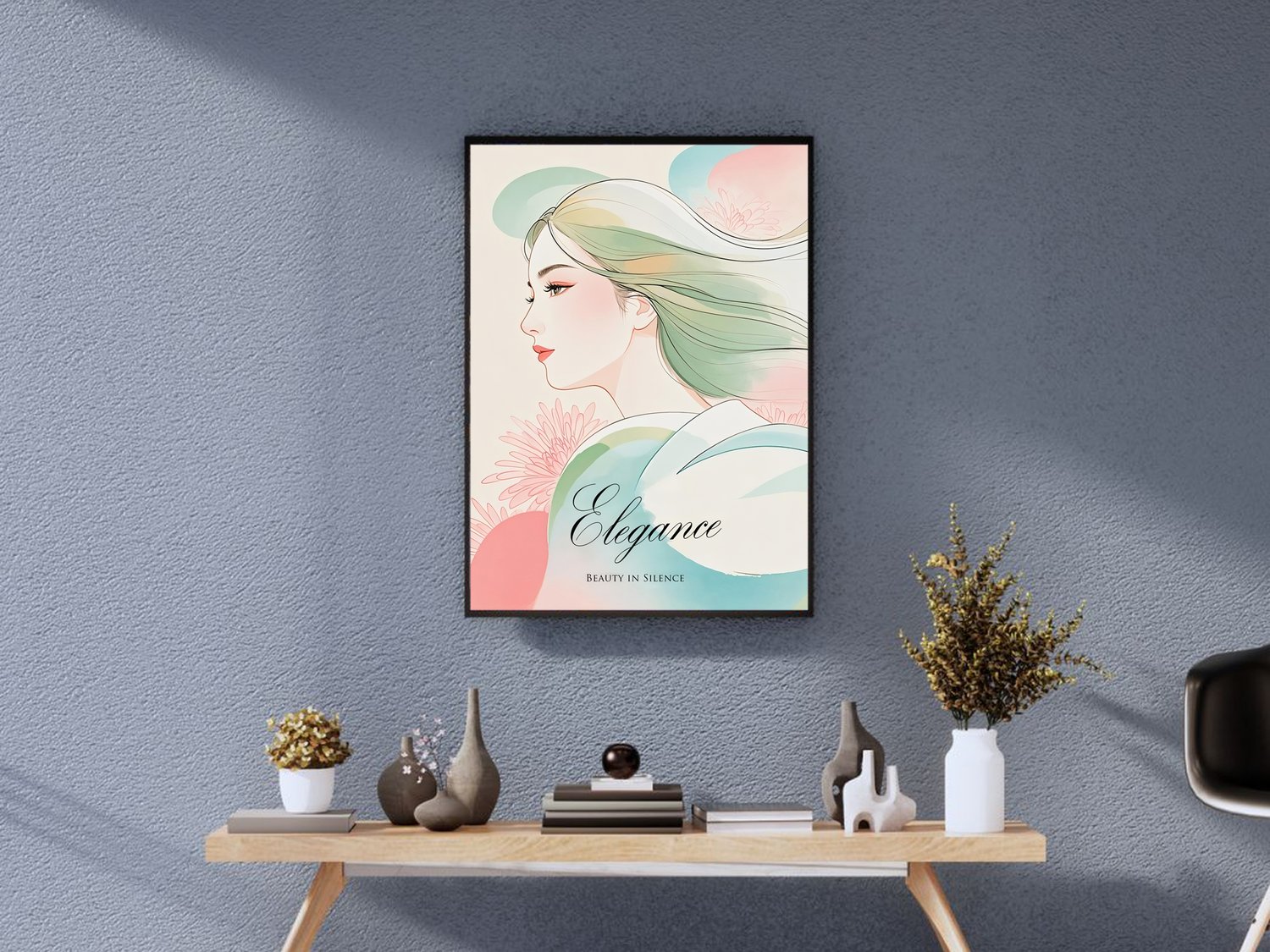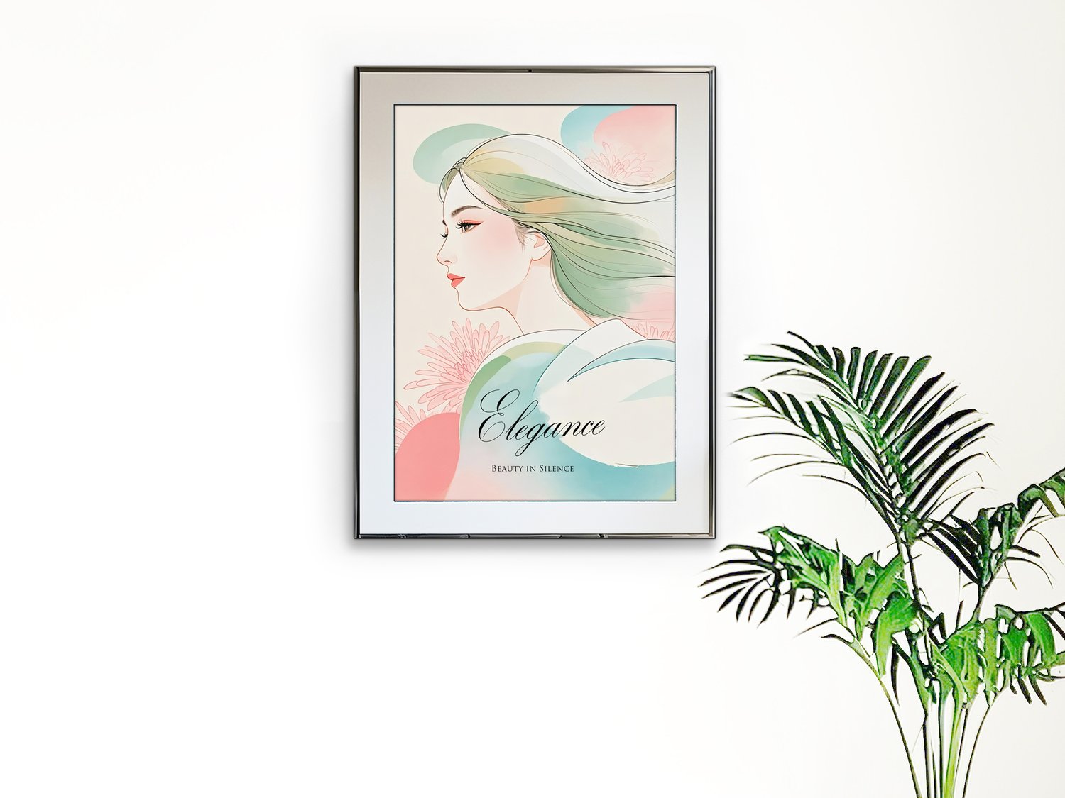 This elegant digital art depicts the profile of a woman with soft pastel colors, floral motifs, and windswept hair. As the title "Elegance" suggests, it expresses beauty and strength in tranquility. It's perfect for your bedroom, study or meditation space. It is an extremely elegant work, with delicate line drawings and gradations of light colors in perfect harmony. The profile of the woman expresses strength and elegance in silence, which makes an impression worthy of the title "Elegance." The pastel tones of the flowers in the background and the flowing movement of the hair make you feel the vibrancy of life while being quiet.