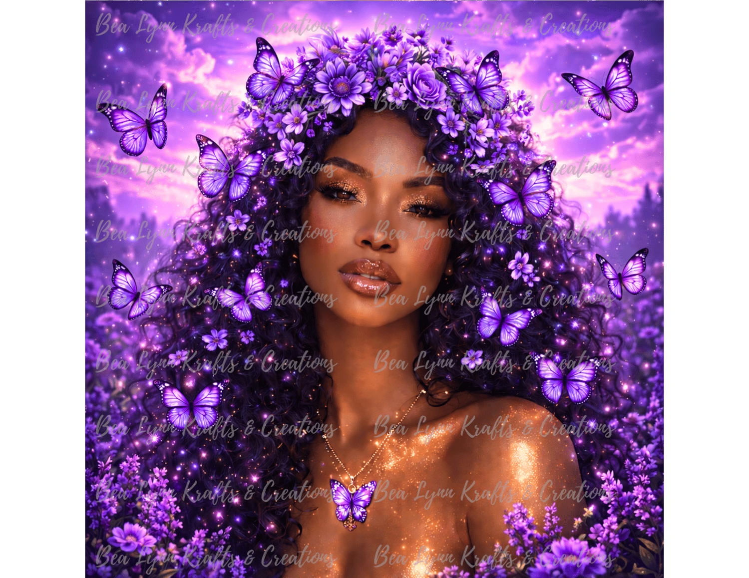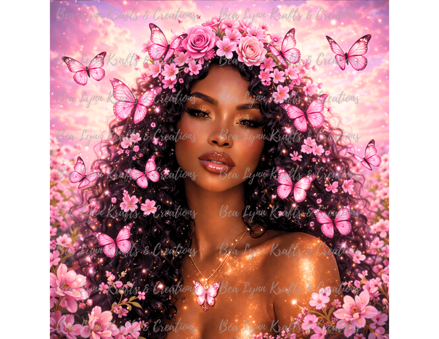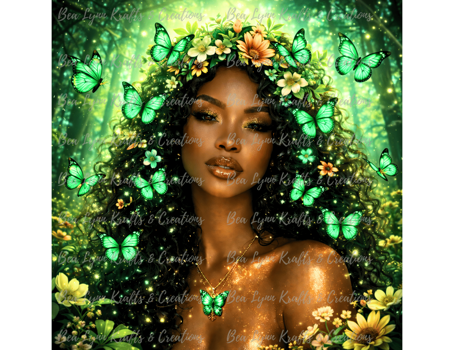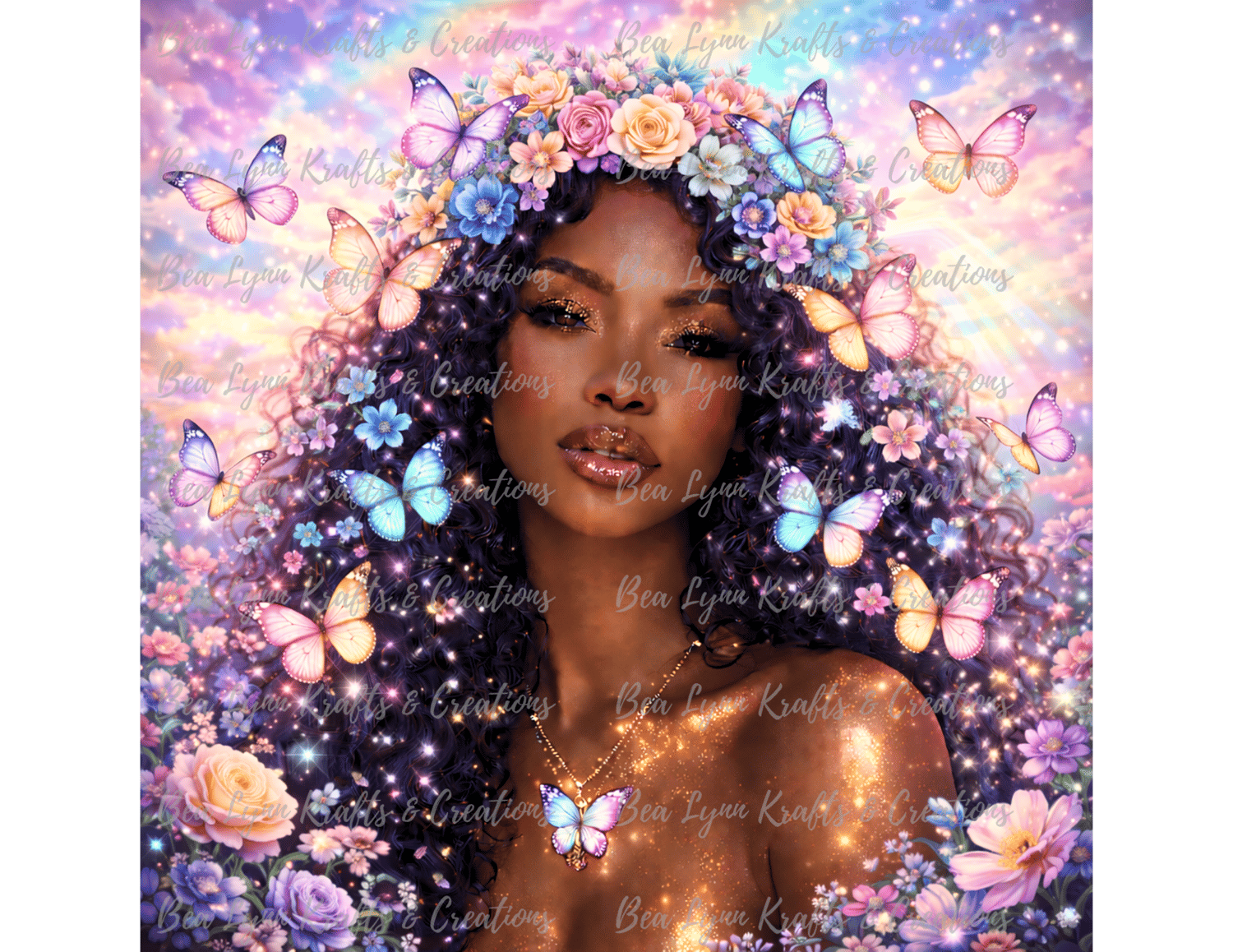 Step into a world of beauty, magic, and transformation with this Butterfly Goddess Fantasy Collection. This stunning bundle includes 10 ultra-detailed fantasy portraits of a radiant African American woman surrounded by glowing butterflies, magical flowers, and dreamy fantasy backgrounds in vibrant colors like gold, pink, emerald, teal, purple, sunset red, ocean blue, silver moonlight, and pastel rainbow.