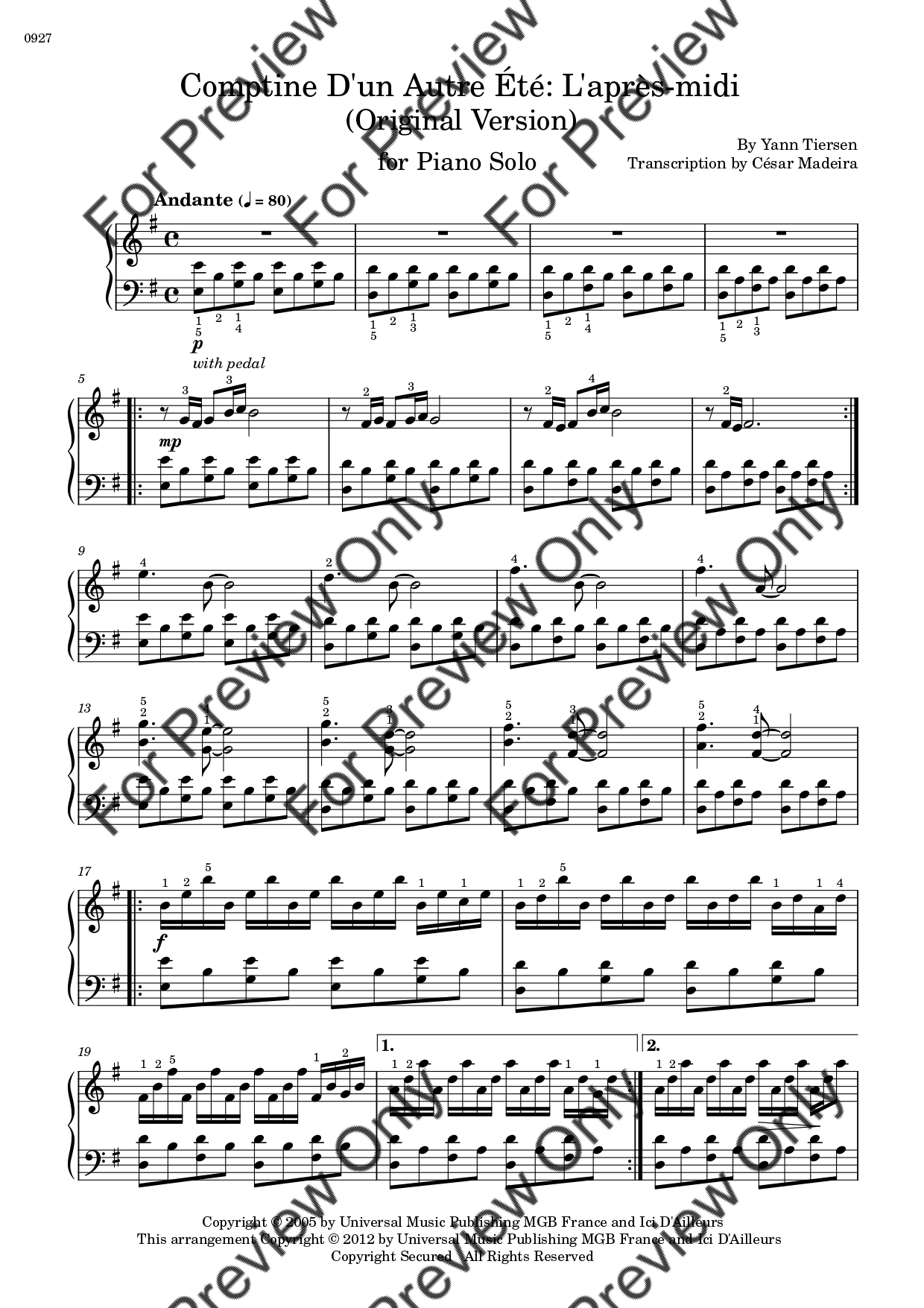 Comptine D'un Autre Été: L'après-midi by Yann Tiersen. Arrangement for Piano Solo. With Full Score. Have fun!
