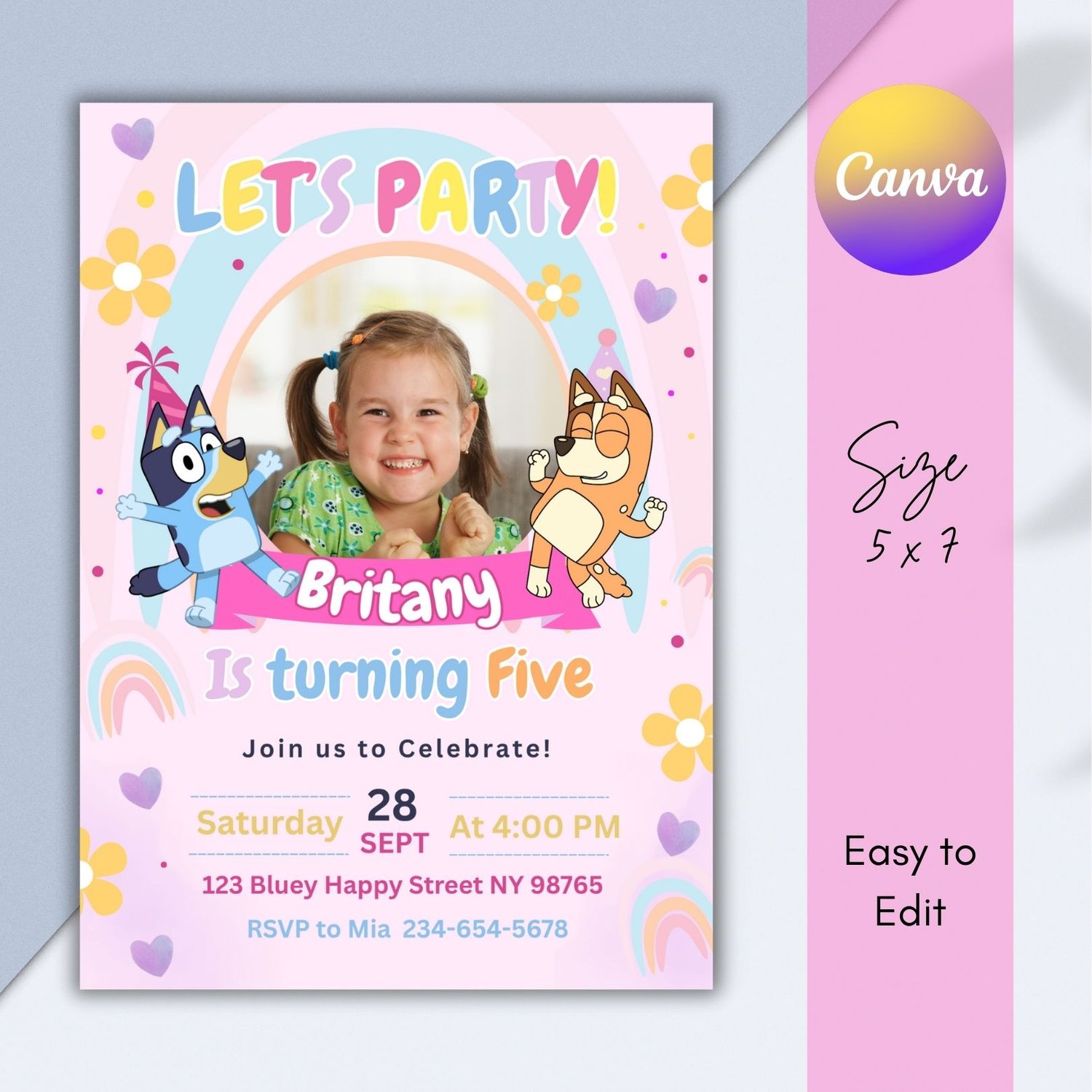 Celebrate your child’s special day with this adorable Bluey birthday invitation 5x7! This editable template is perfect for any Bluey-themed party. Instantly download and personalize your invitation using Canva – no software needed!