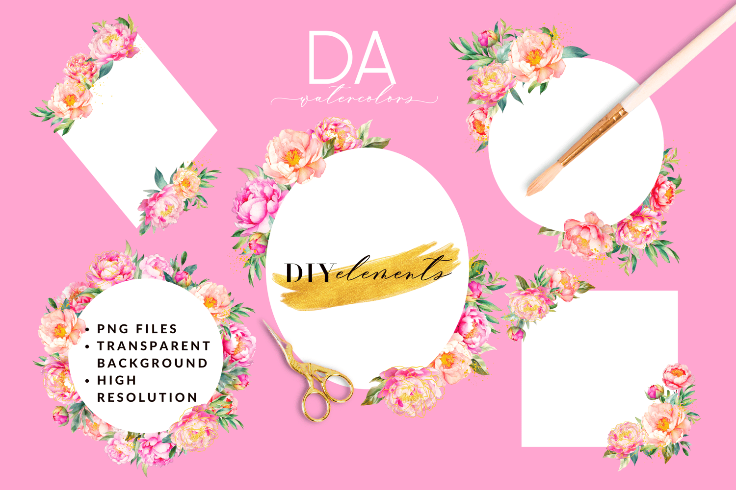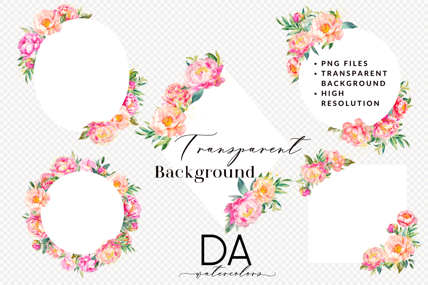 - 5 PNG Elements in Total, 300 DPI of DIY Watercolor Peony Flowers Frame (Transparent Background)
