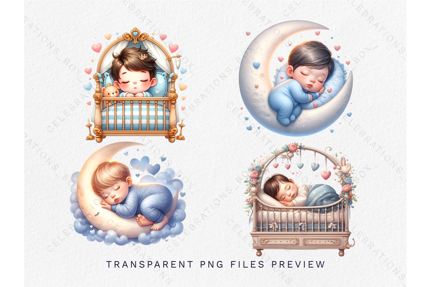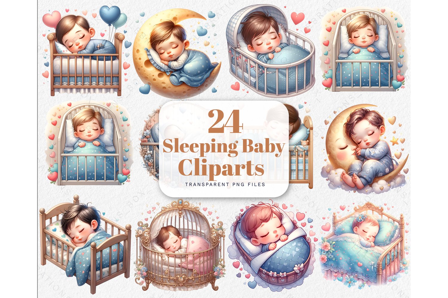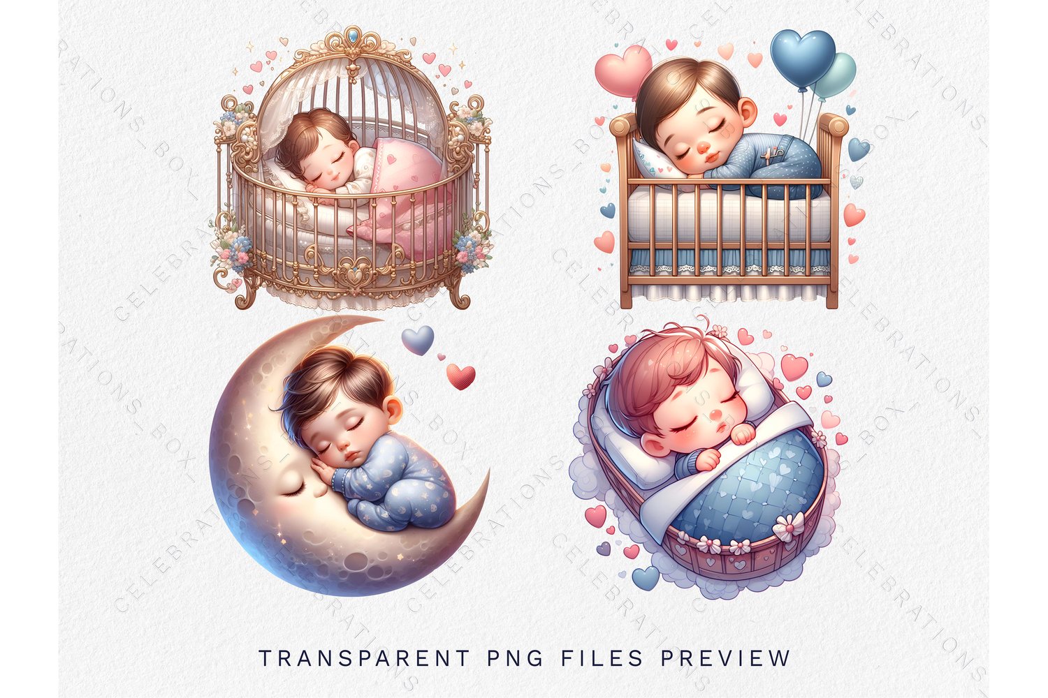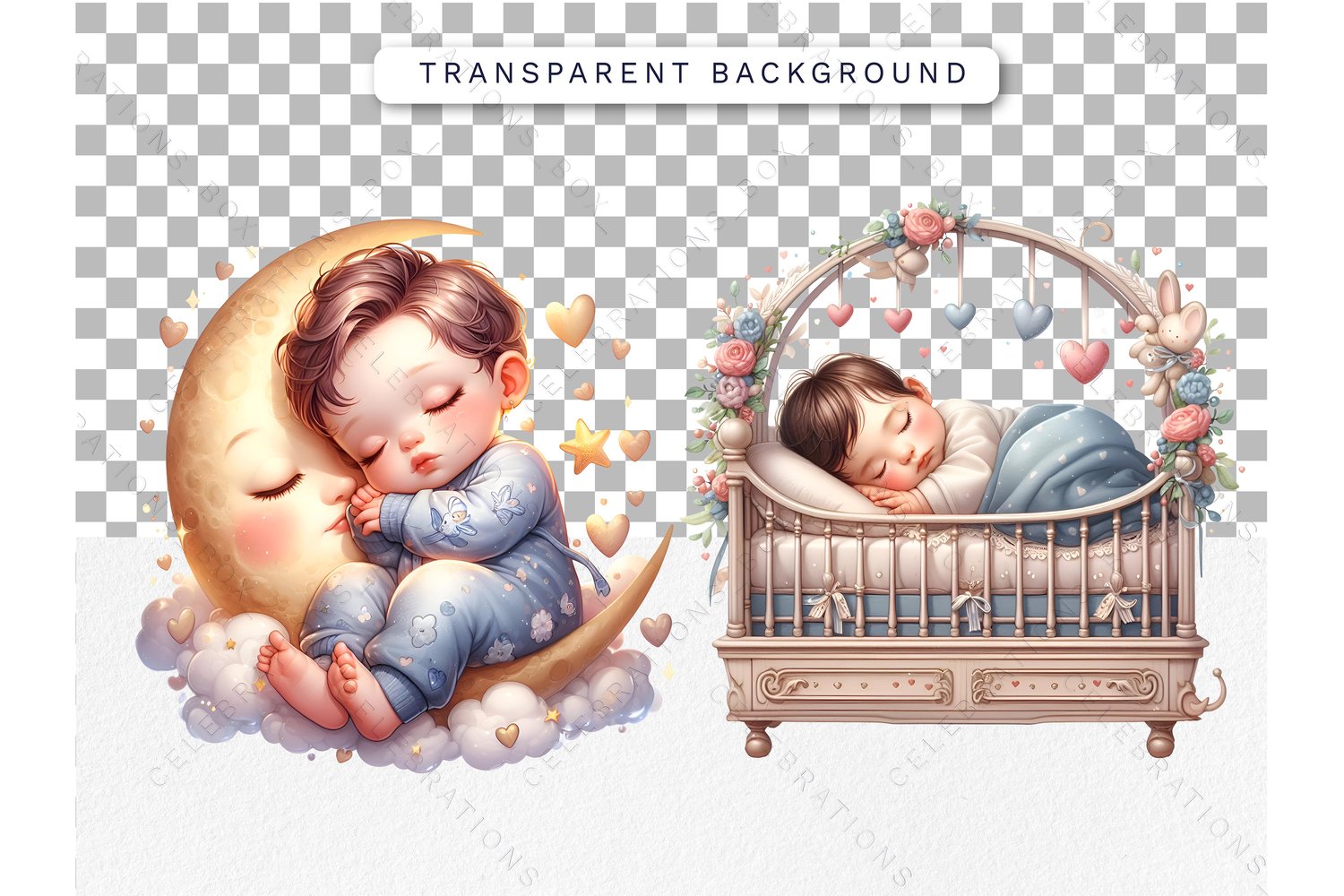 Looking for the perfect way to add a touch of elegance and whimsy to your baby shower decor? Look no further than our watercolor baby sleeping in Cradle clipart set! Our 24 pieces include everything from a sleeping baby boy to a sleeping baby girl, as well as a Sleeping Moon. Whether you're using these pieces for a nursery décor or for your baby shower decorations, they'll be a hit with everyone who sees them!