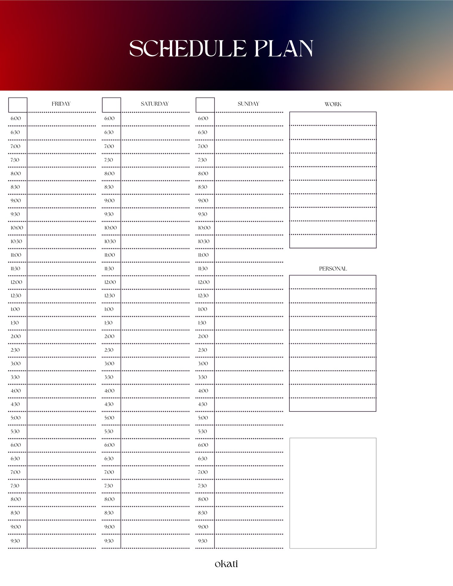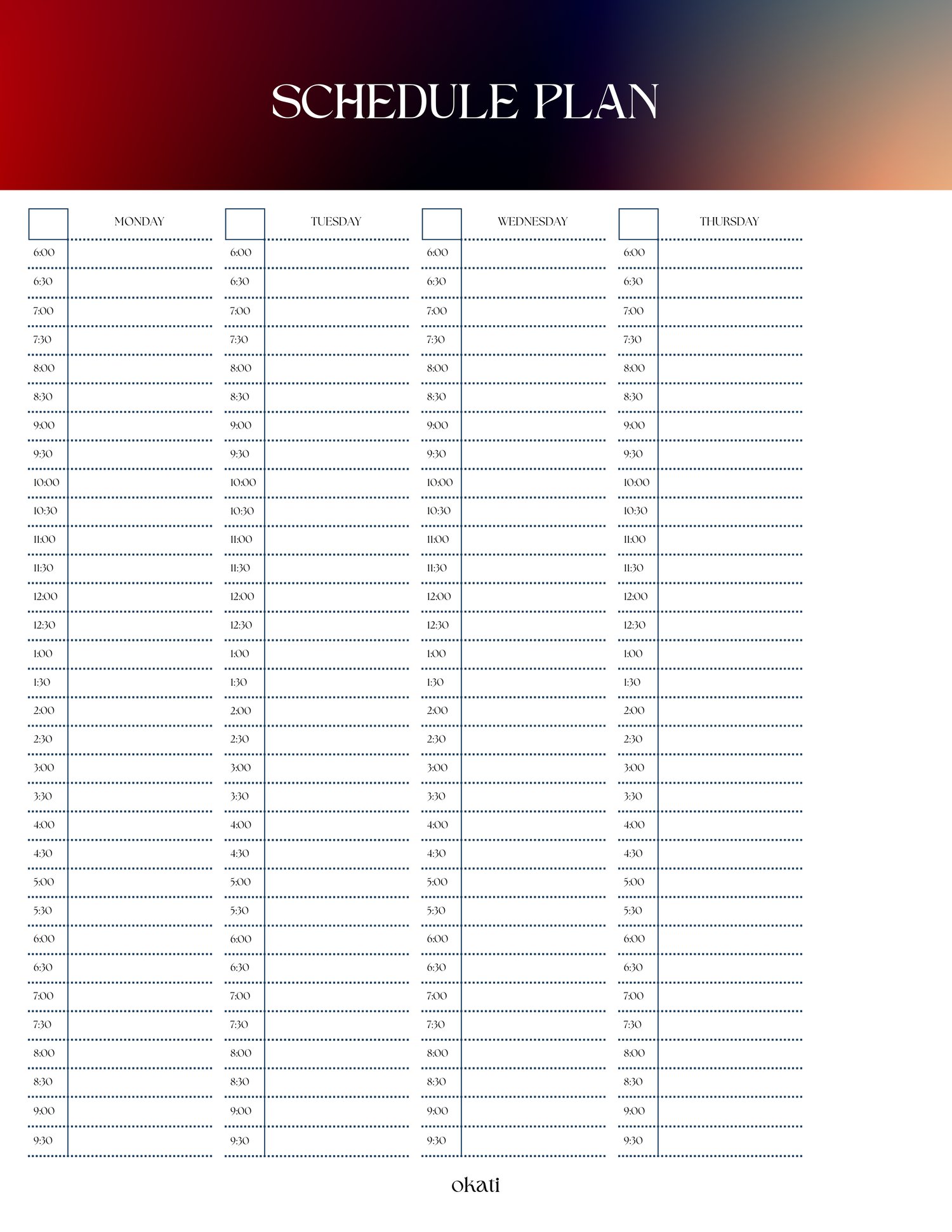 • Daily Time Slots: Each day is broken down into 30-minute intervals from 6:00 AM to 9:30 PM.