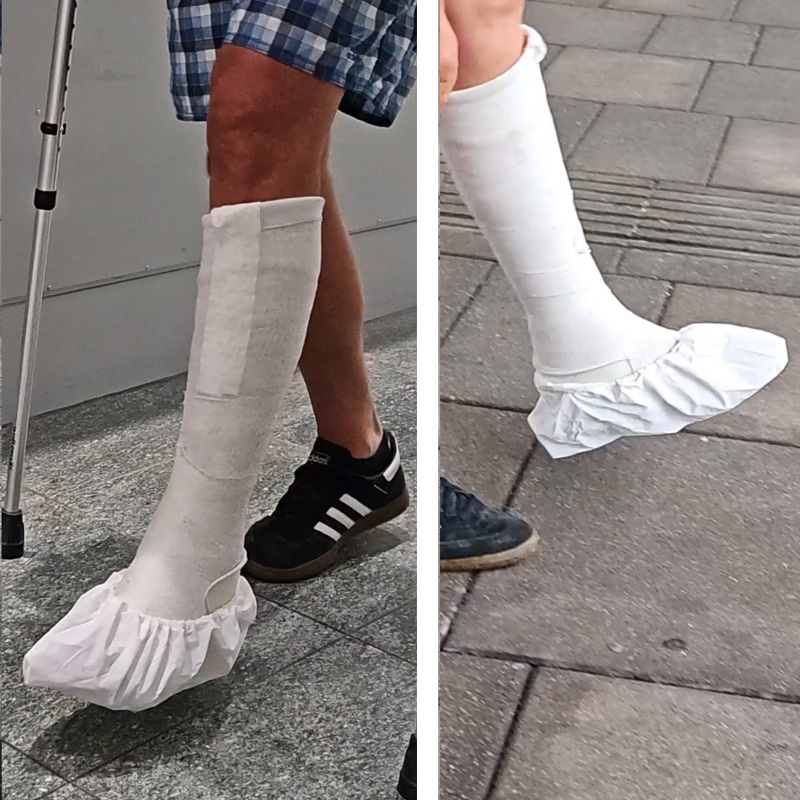 WHITE SPLIT PLASTER SLC, SHORT PANTS, SPORTIVE SHOE...ALWAYS ON CRUTCHES