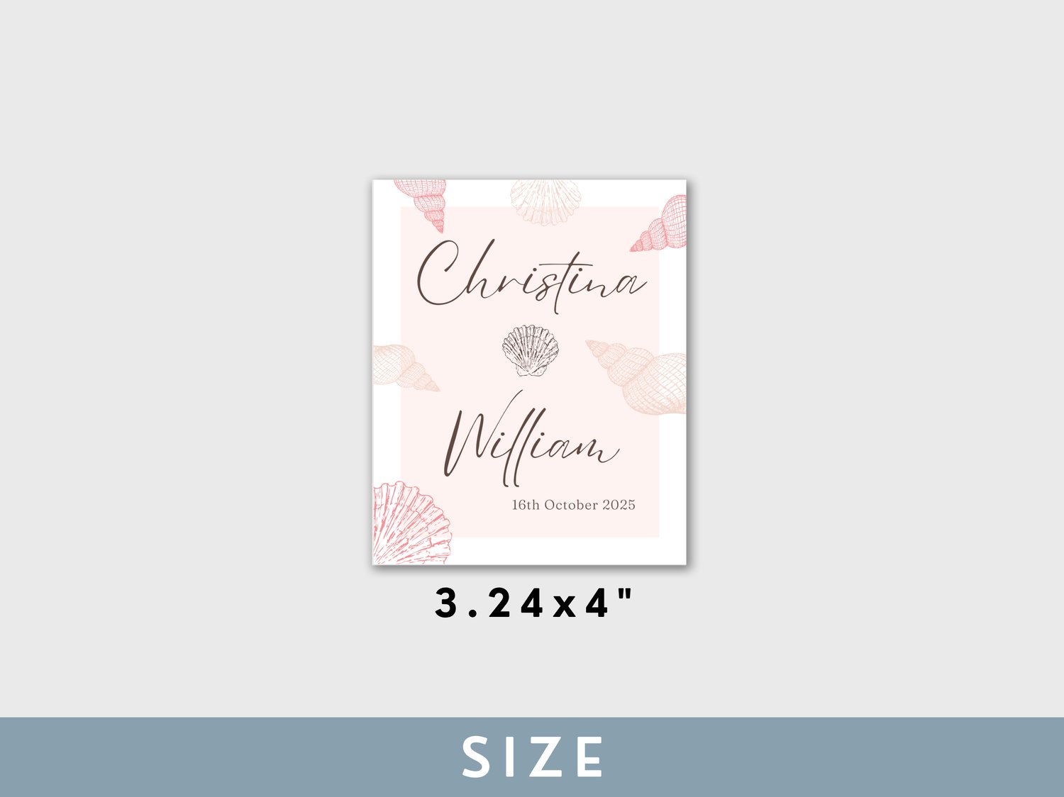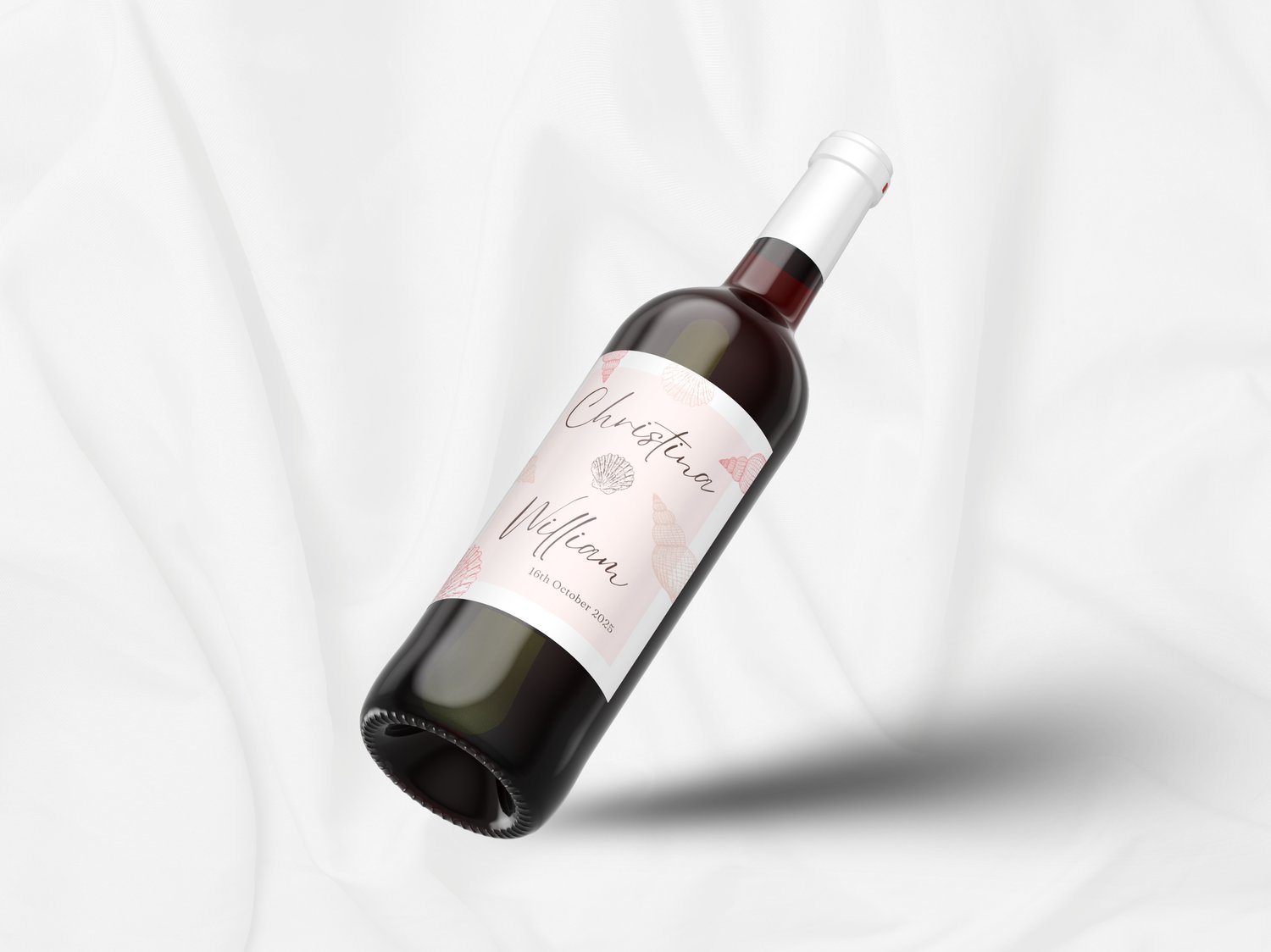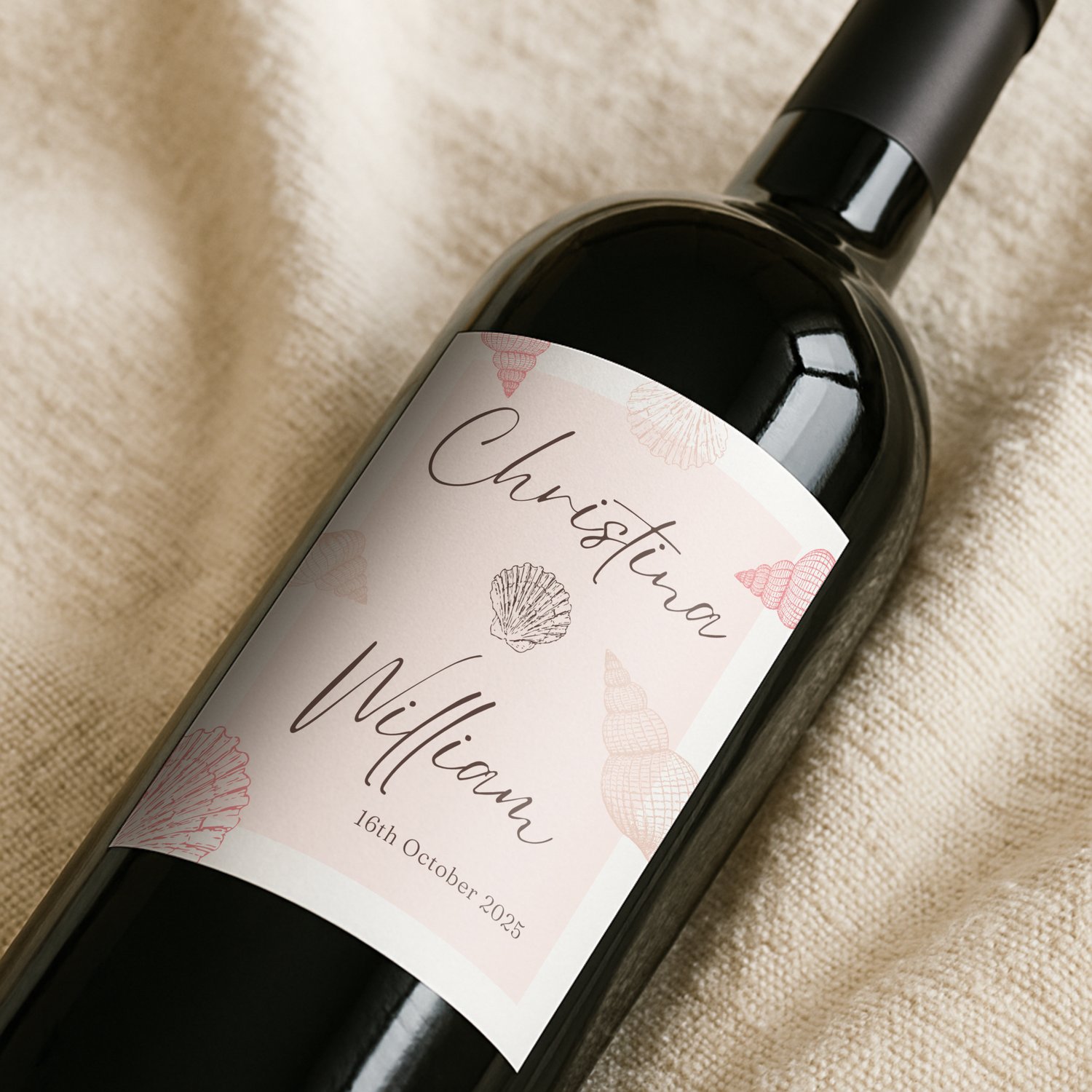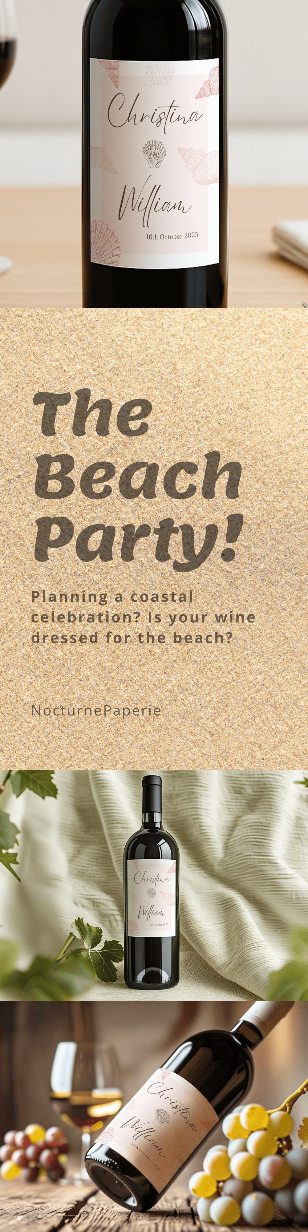 Bring seaside elegance to your celebration with this beach wedding wine label in a pink coastal theme. The custom wine bottle sticker is perfect for a tropical summer wedding dinner table decor. It’s part of our seasonal collection on NocturnePaperie—explore other seasons like Spring, Autumn, and Winter.