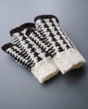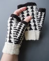 Yarn choices: The mitts’ combination of slip stitches and garter stitch makes for a super dense and cosy fabric. Try choosing shades that are highly contrasting (as per the sample), or perhaps a wildly variegated yarn for A (in place of the lighter colour) and a solid shade for B.
