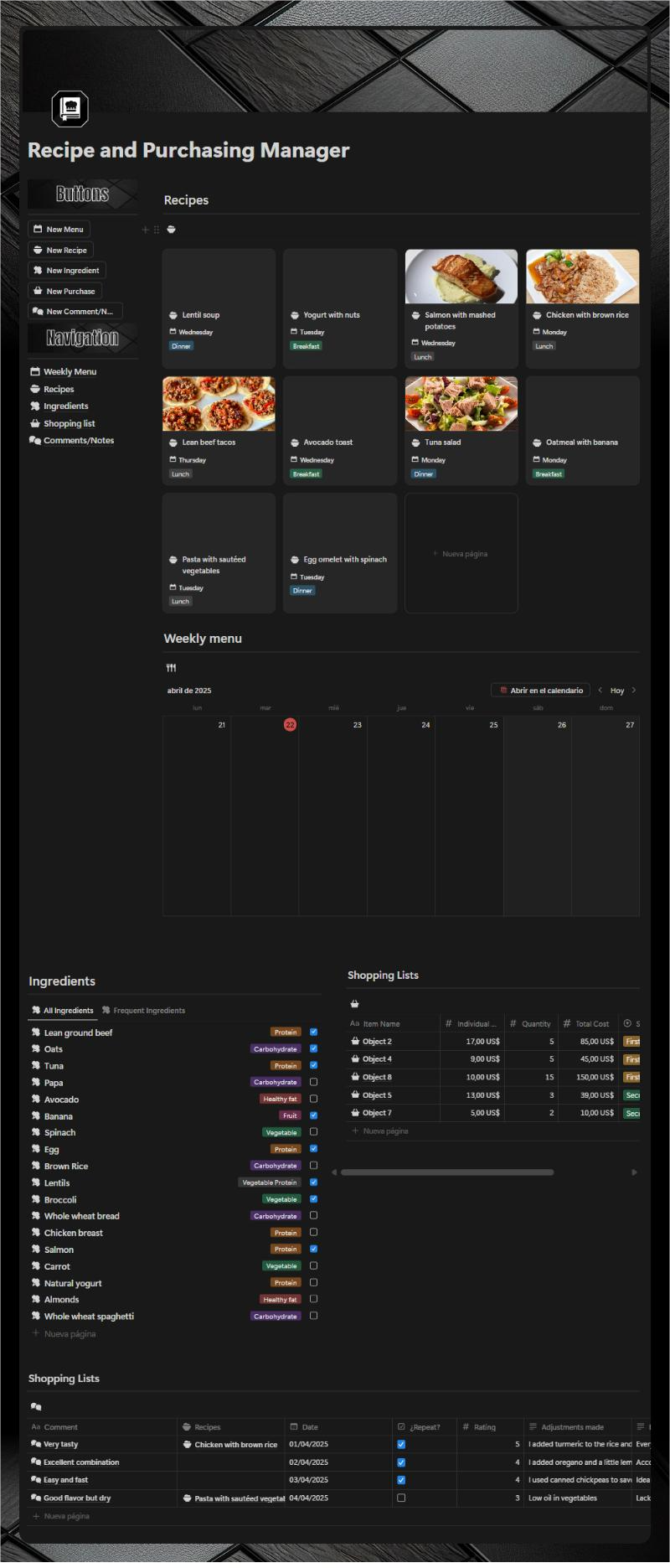 Transform your kitchen experience and simplify your weekly planning with this Notion template. With an intuitive and practical structure, you can organize menus, manage ingredients, and avoid unnecessary purchases. Ideal for those looking to eat well without complicating things.