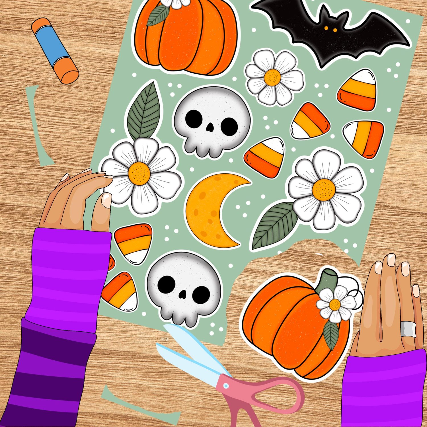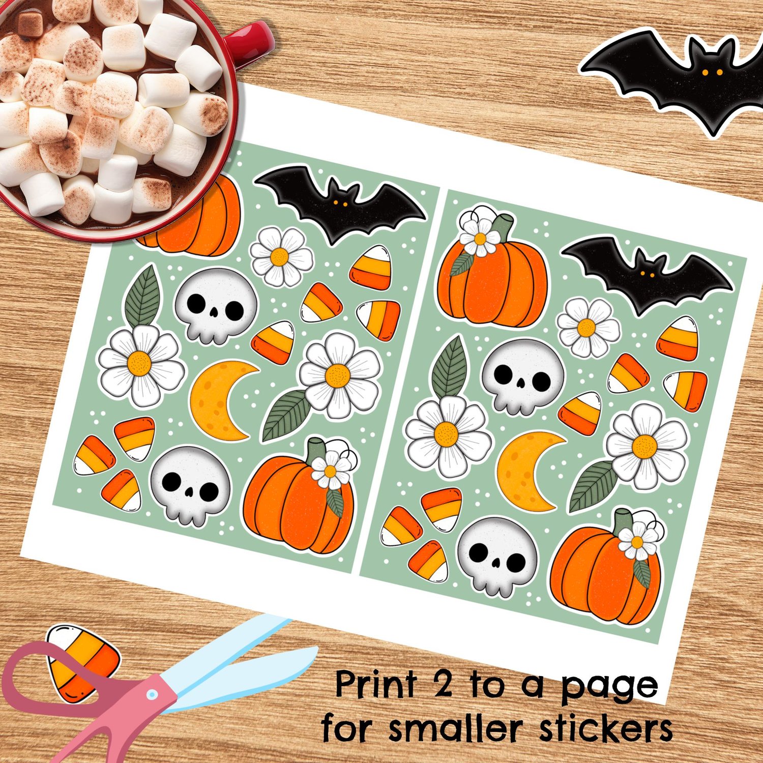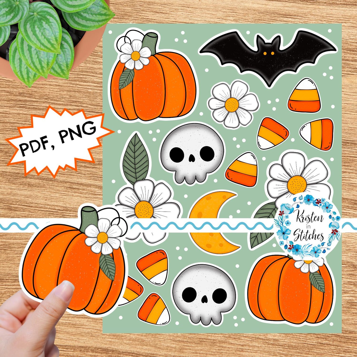 Halloween Haunts Printable Sticker Sheets, PDF PNG, DIY Print & Cut Paper Crafts, Fall Thanksgiving Skulls and Pumpkins
