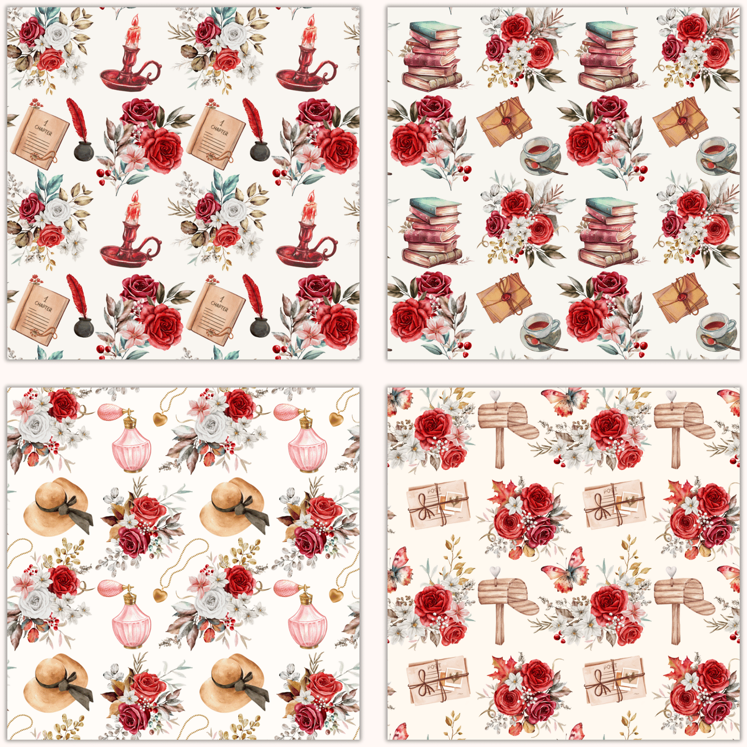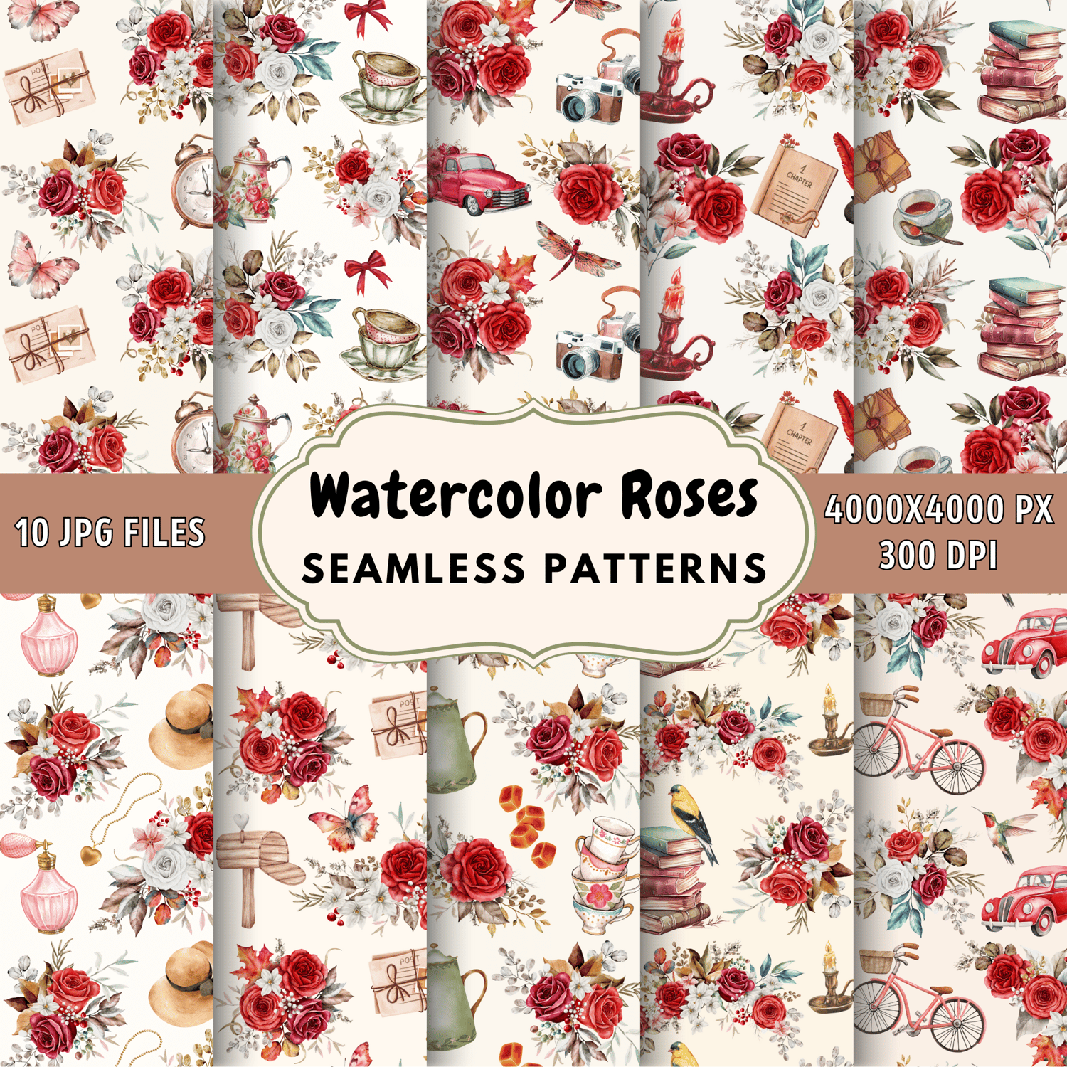 Watercolor Roses & Vintage Accents - 10 Seamless Patterns