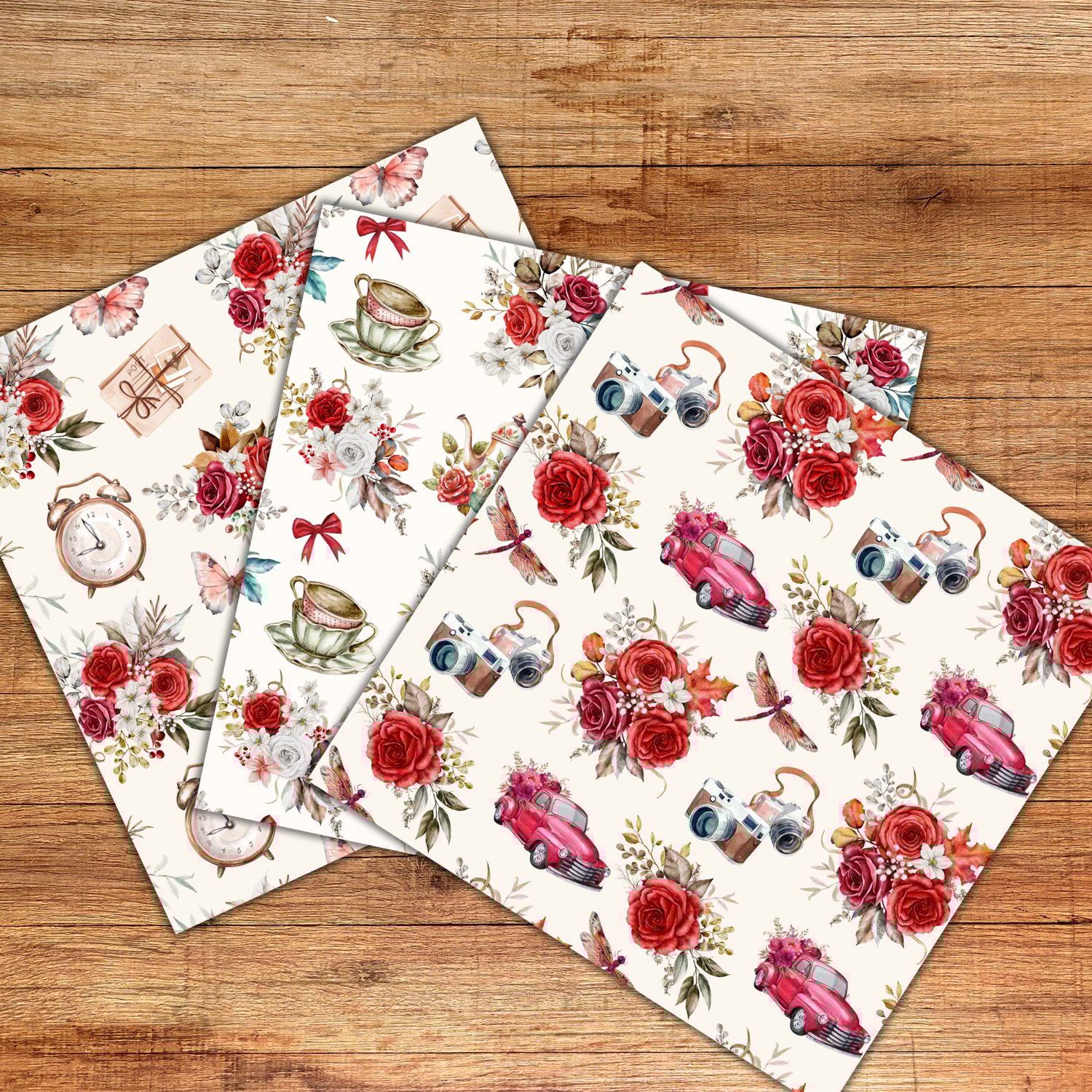 Bring timeless charm to your creative projects with this enchanting collection of 10 seamless watercolor patterns featuring delicate rose bouquets paired with vintage-inspired treasures. From whimsical tea pots and tea cups to charming cameras, bicycles, books, and fluttering butterflies, each design is rich in nostalgic detail and painted in soft, romantic watercolor tones. Perfect for adding a touch of elegance and vintage flair to stationery, scrapbooking, fabric design, and more.