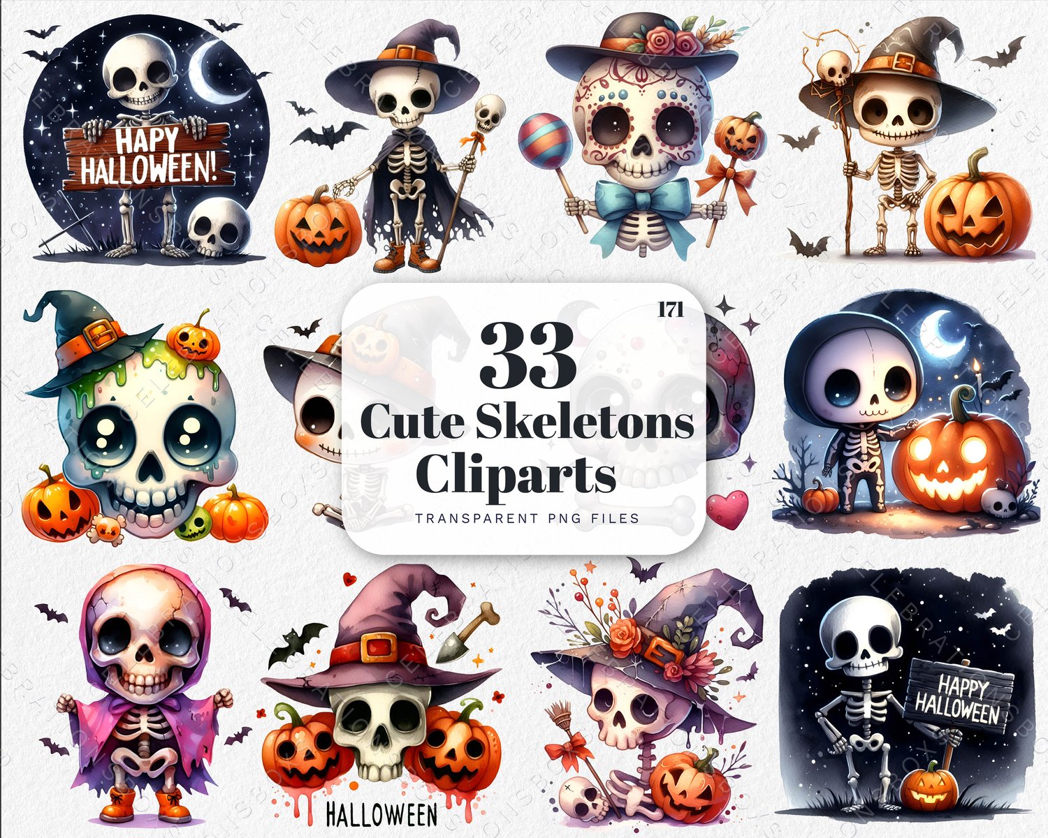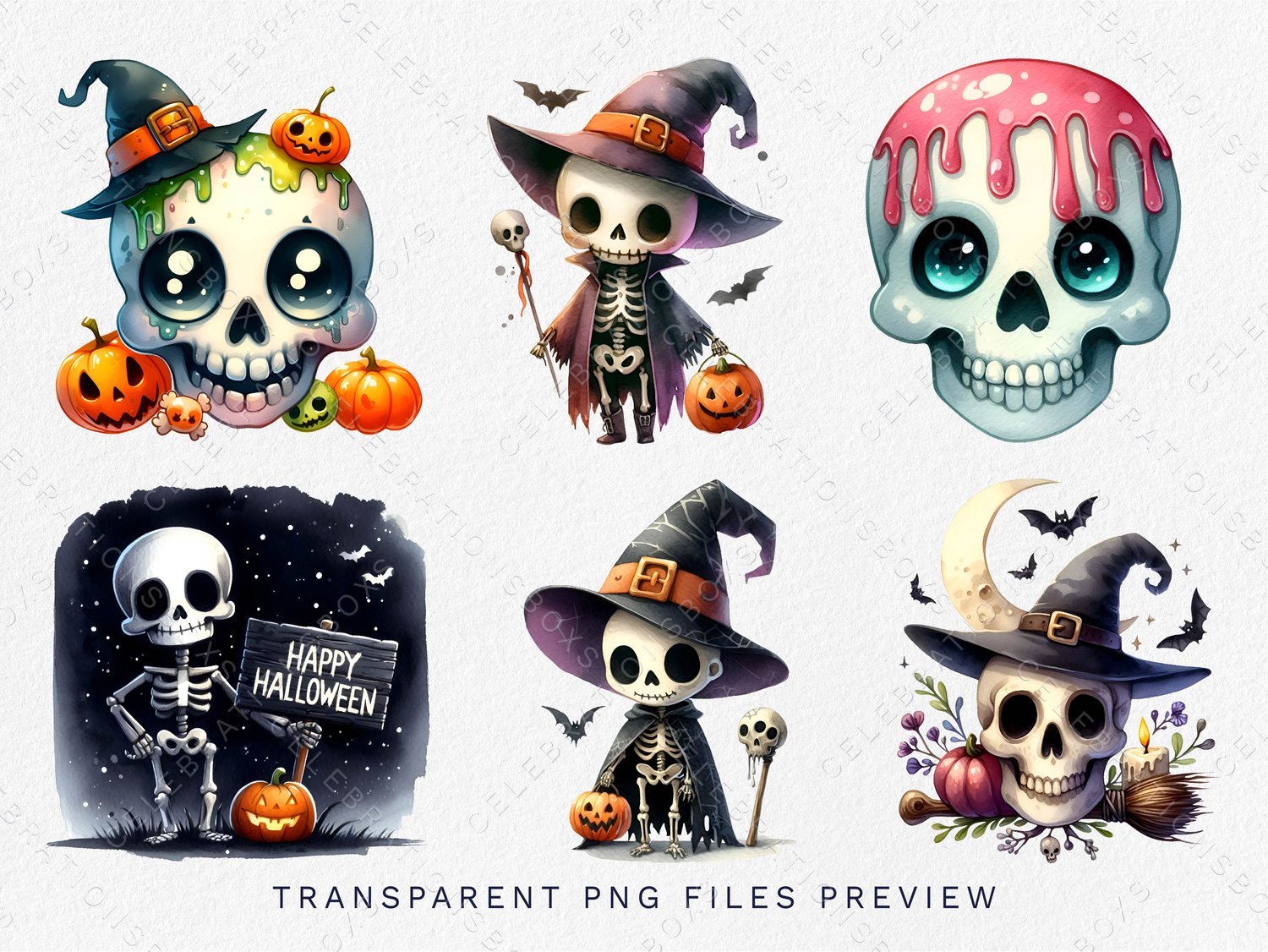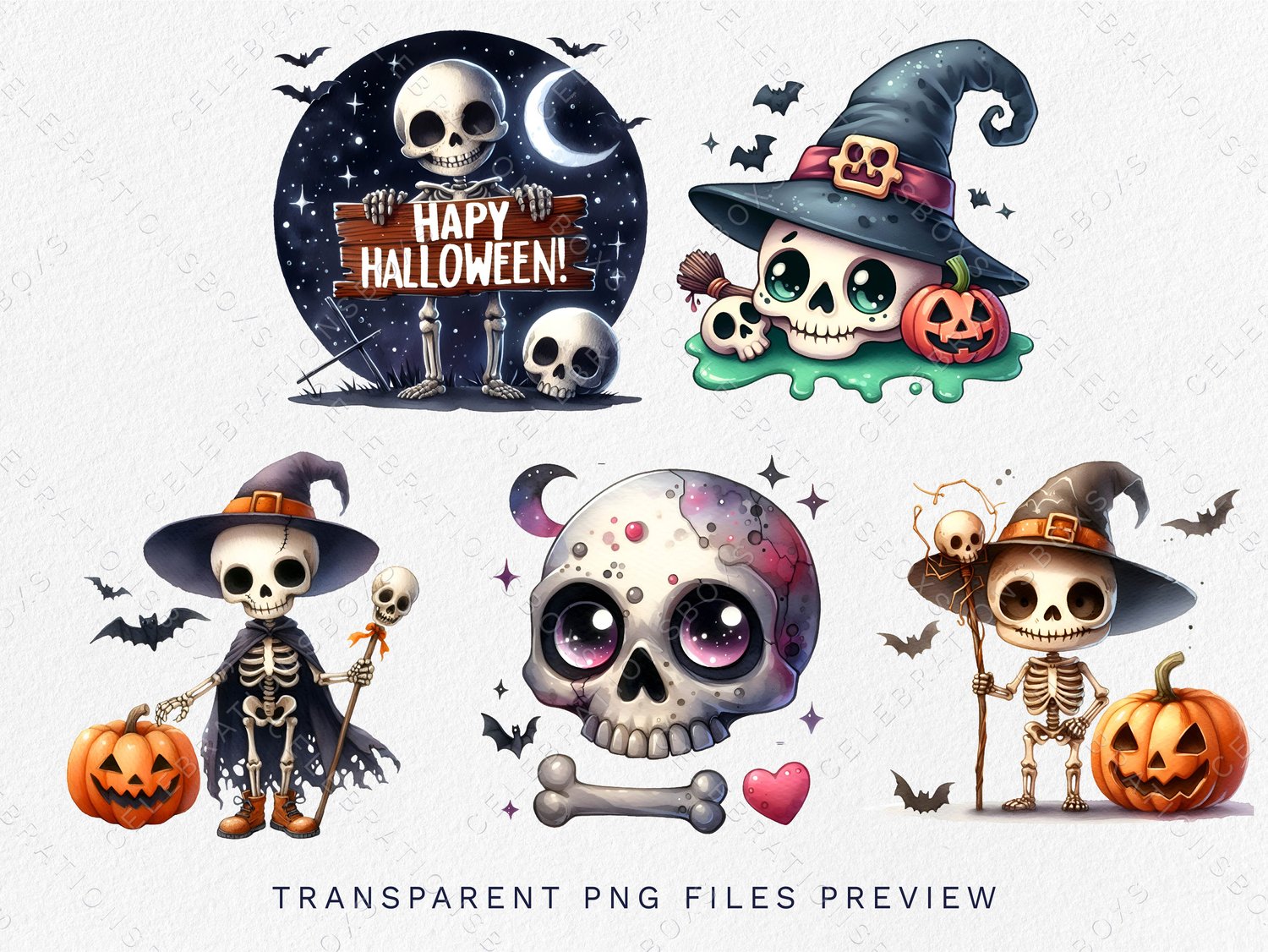 Embrace the playful side of Halloween with our "Watercolor Halloween Skeleton Clipart". This collection features 33 charming Skeleton PNG, each showcasing endearing and skull clipart that are perfect for adding a whimsical touch to your Halloween-themed projects. Let your imagination dance with these Halloween Graphics !