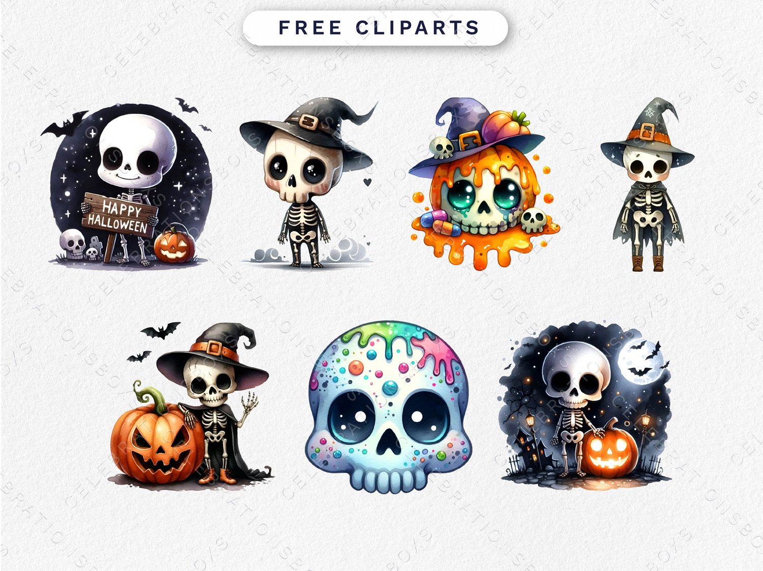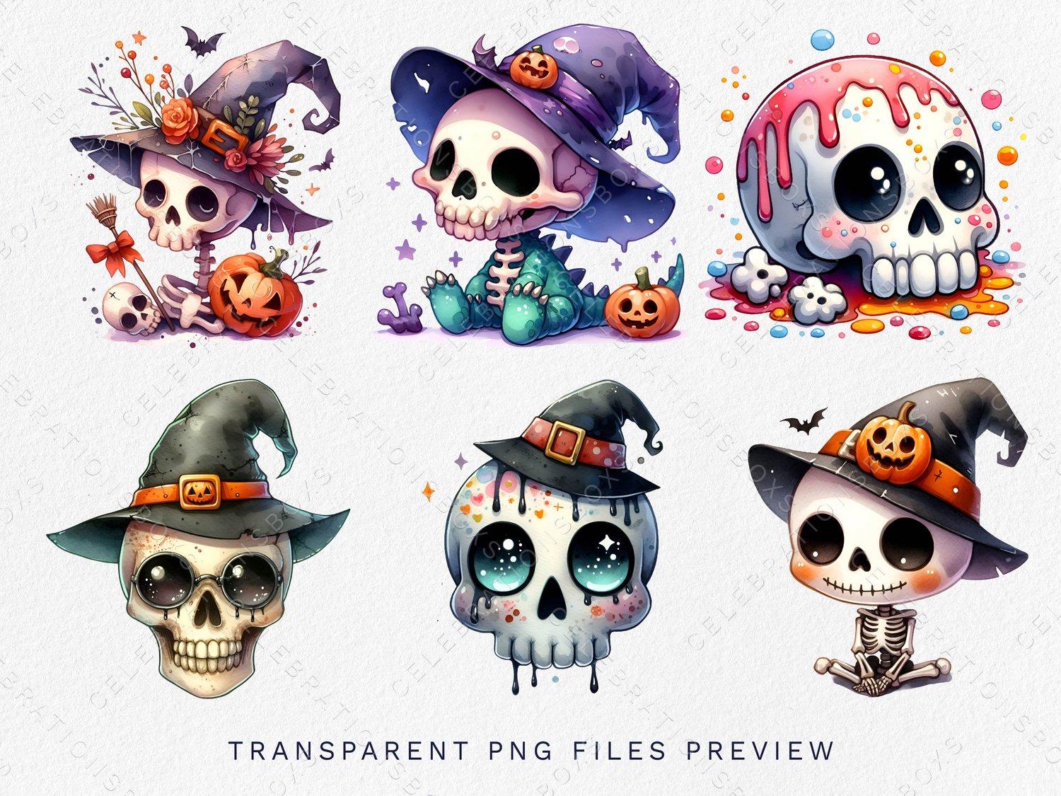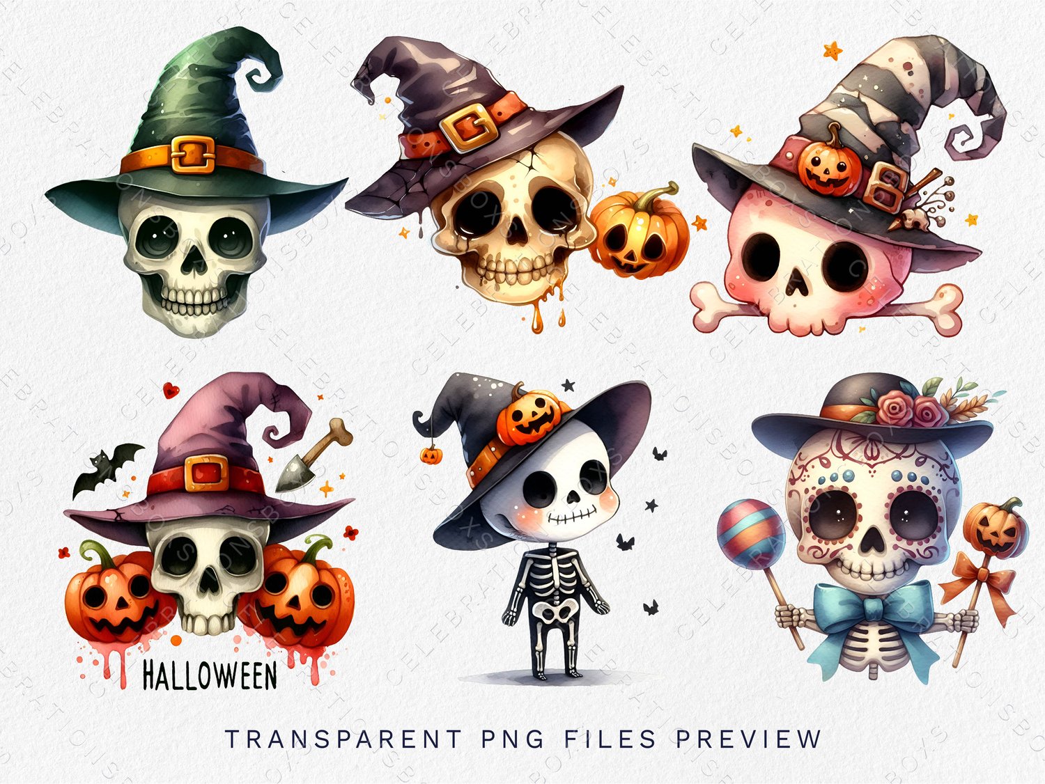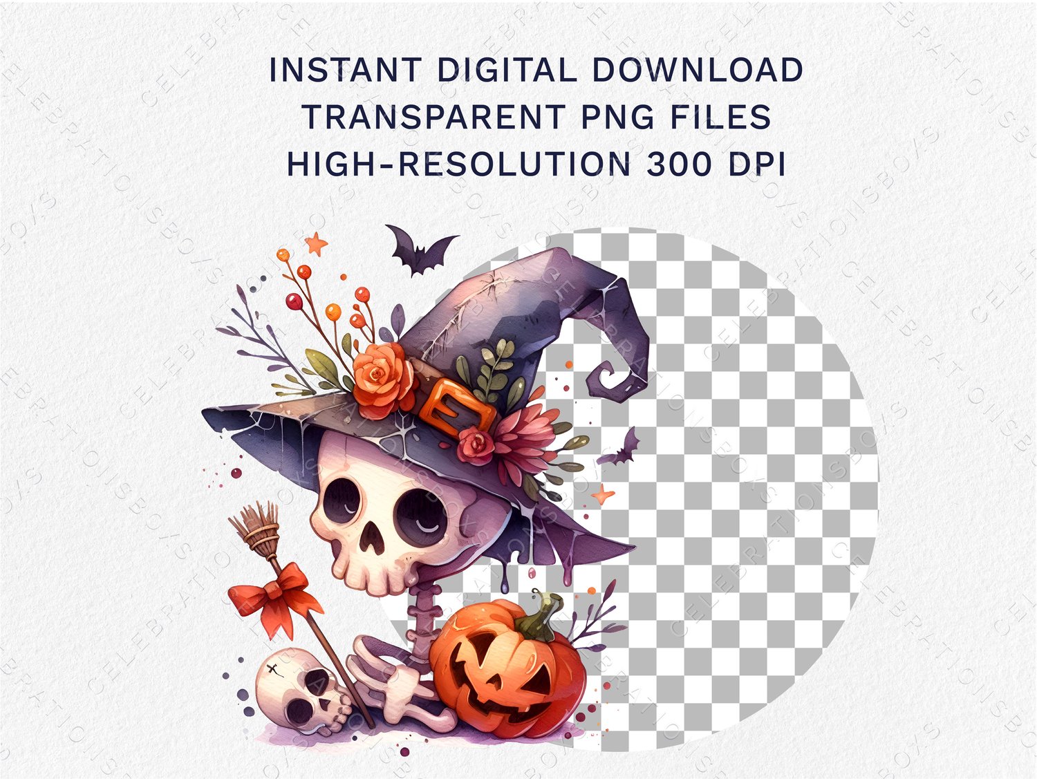Embrace the playful side of Halloween with our "Watercolor Halloween Skeleton Clipart". This collection features 33 charming Skeleton PNG, each showcasing endearing and skull clipart that are perfect for adding a whimsical touch to your Halloween-themed projects. Let your imagination dance with these Halloween Graphics !