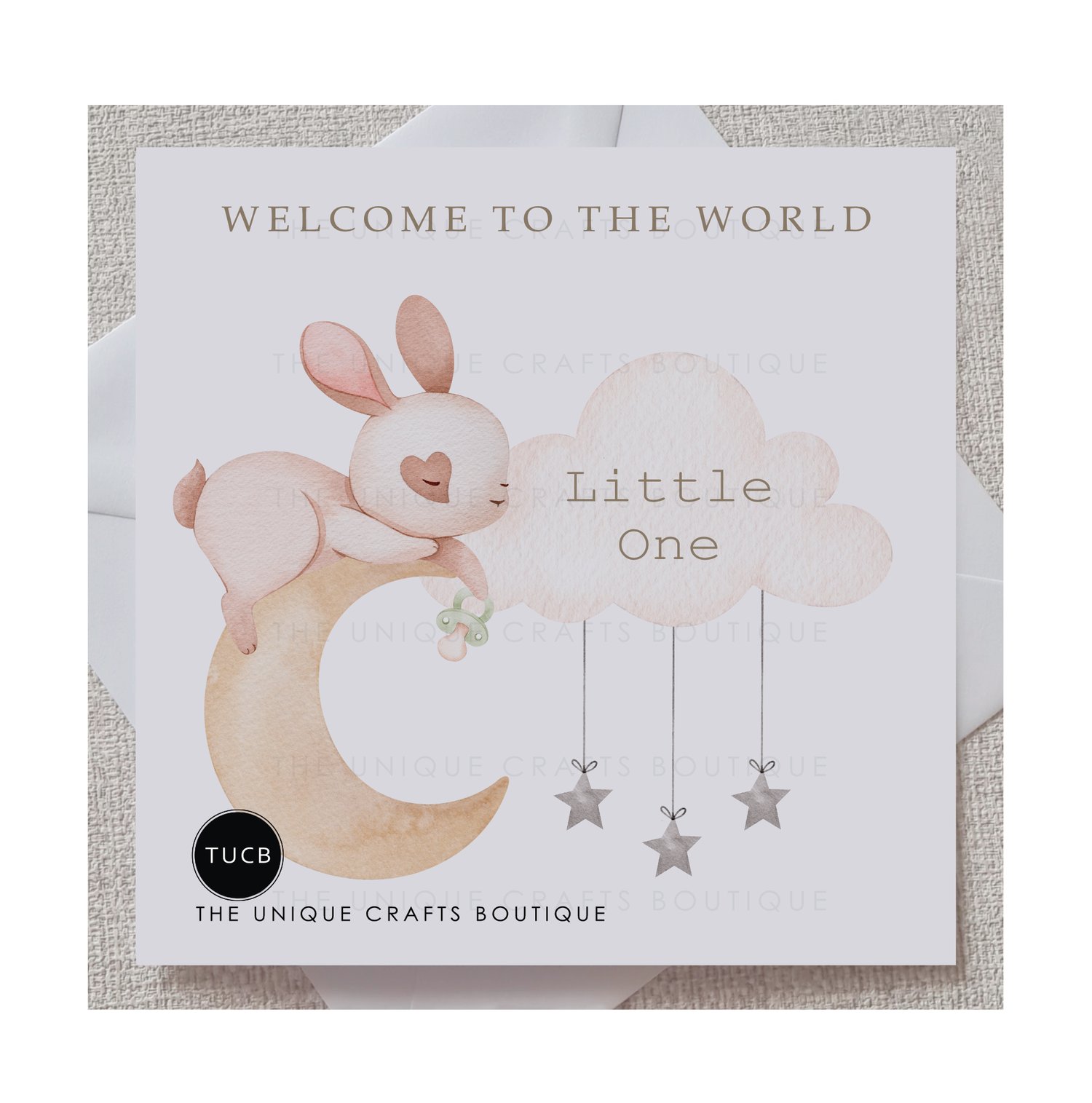 This card is perfect for a brand new Baby. Printed with a sleepy Bunny resting on the moon and gently holding onto his dummy surrounded by stars and clouds.