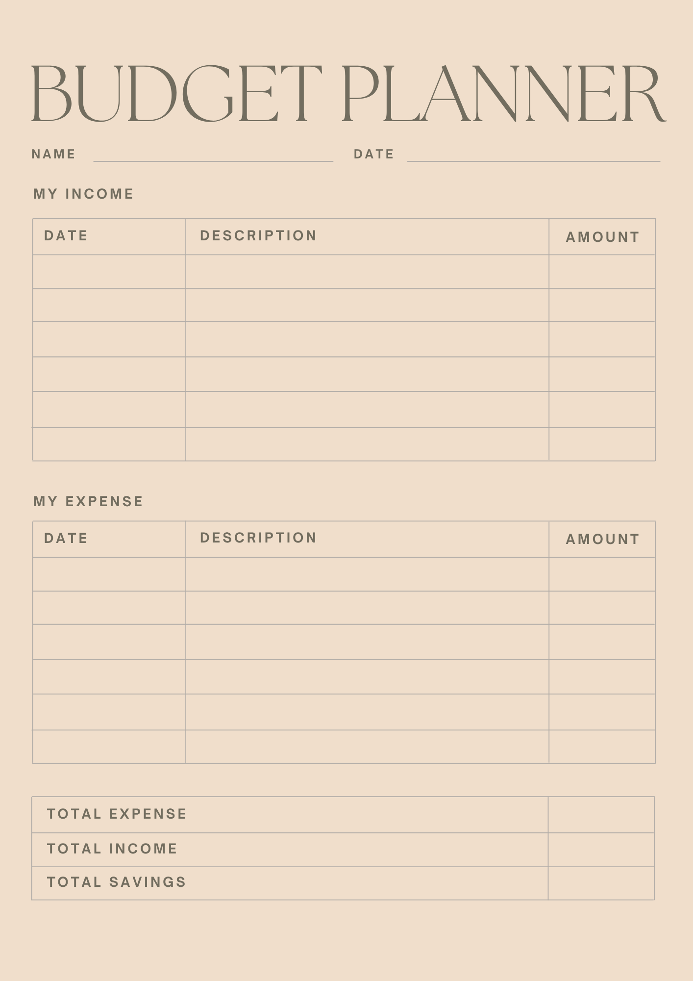 - A Budget Planner to help you create and maintain a monthly budget, with sections for expenses, income, and savings.